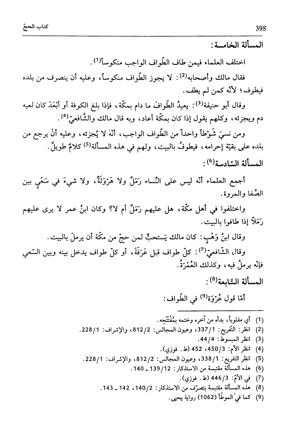 (¬6) هذه المسألة مقتبسة من الاستذكار: 12/ 139 - 140.