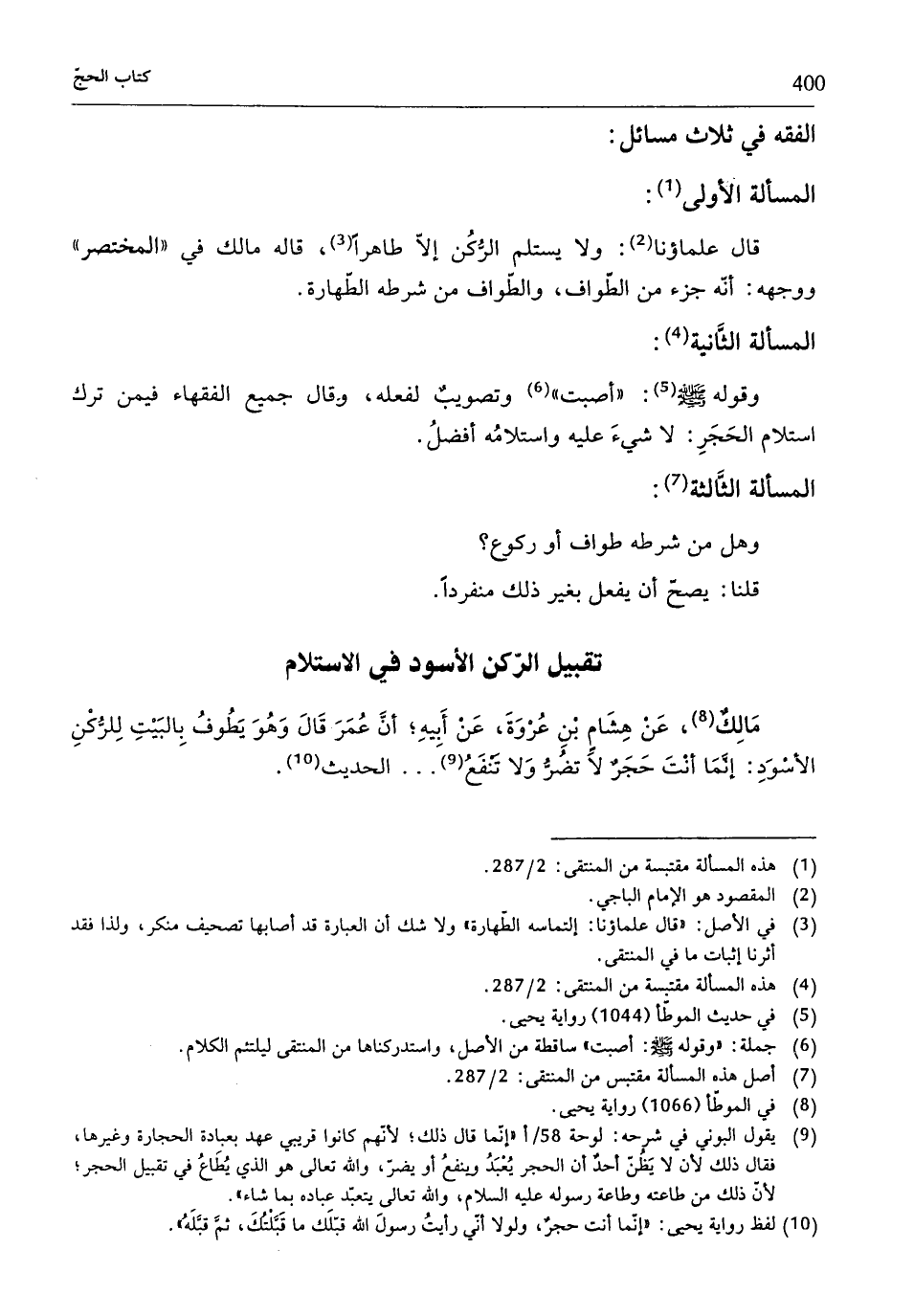 (¬3) في الأصل: "قال علماؤنا: إلتماسه الطّهارة" ولا شك أنّ العبارة قد أصابها تصحيف منكر، ولذا فقد أثرنا إثبات ما في المنتقى.