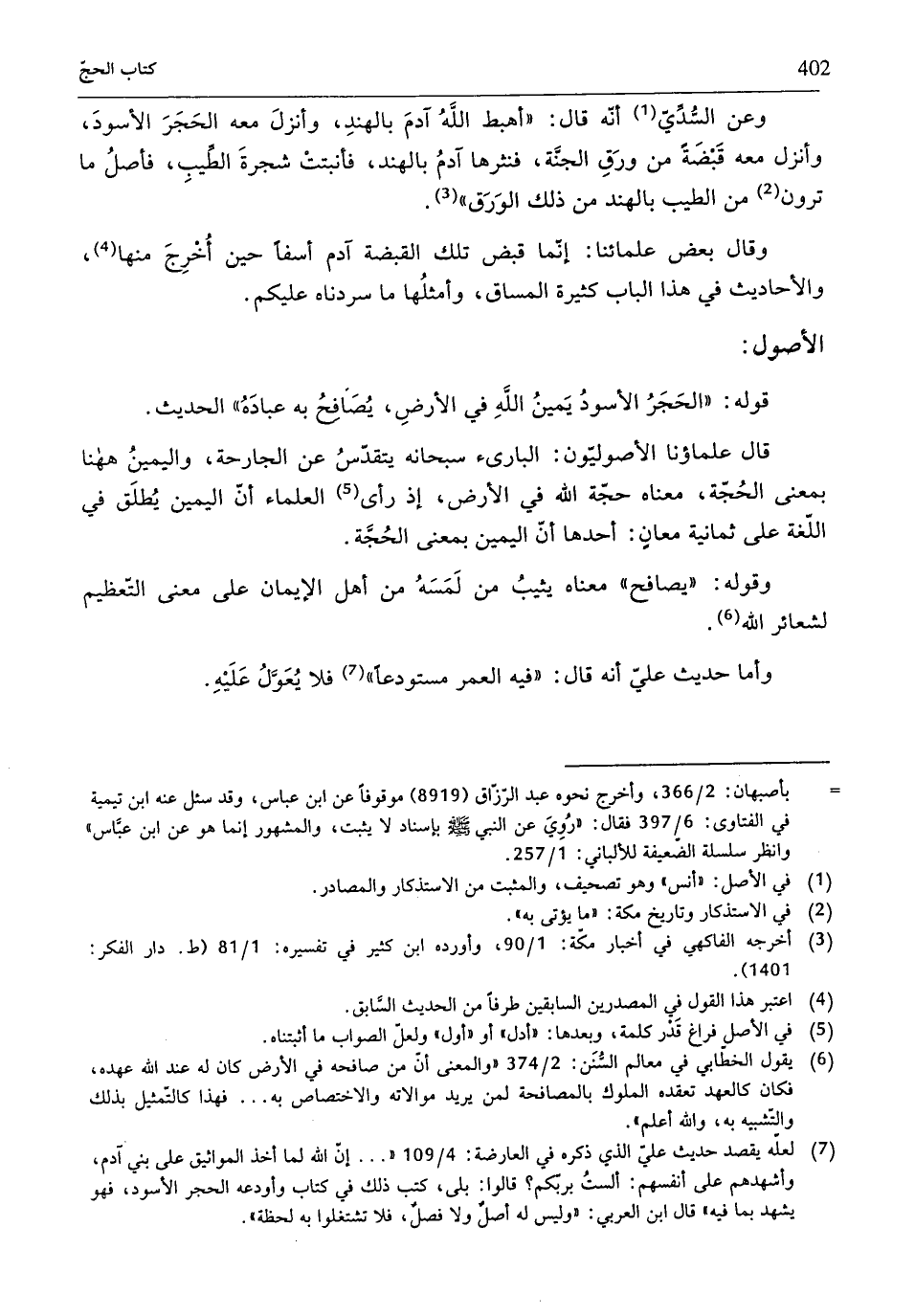 (¬7) لعلّه يقصد حديث علىّ الّذي ذكره في العارضة: 4/ 109 " ... إنَّ الله لما أخذ المواثيق علي بني آدم، وأشهدهم على أنفسهم: ألستُ بربكم؟ قالوا: بلى، كتب ذلك في كتاب وأودعه الحجر الأسود، فهو يشهد بما فيه" قال ابن العربي: "وليس له أصلٌ ولا فصلٌ، فلا تشتغلوا به لحظة".
