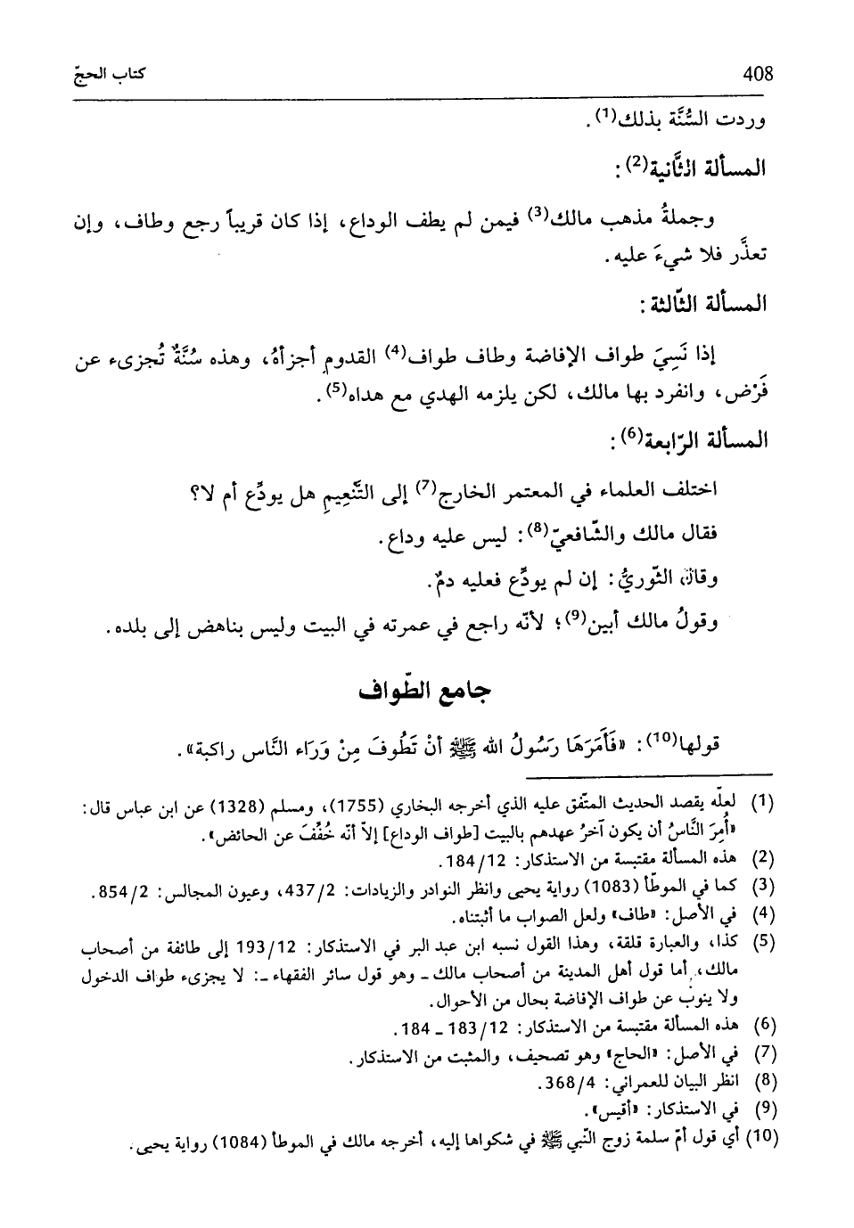 (¬5) كذا، والعبارة قلقة، وهذا القول نسبه ابن عبد البرّ في الاستذكار: 12/ 193 إلى طائفة من أصحاب مالك، أمّا قول أهل المدينة من أصحاب مالك -وهو قول سائر الفقهاء-: لا يجزئ طواف الدخول ولا ينوب عن طواف الإفاضة بحال من الأحوال.