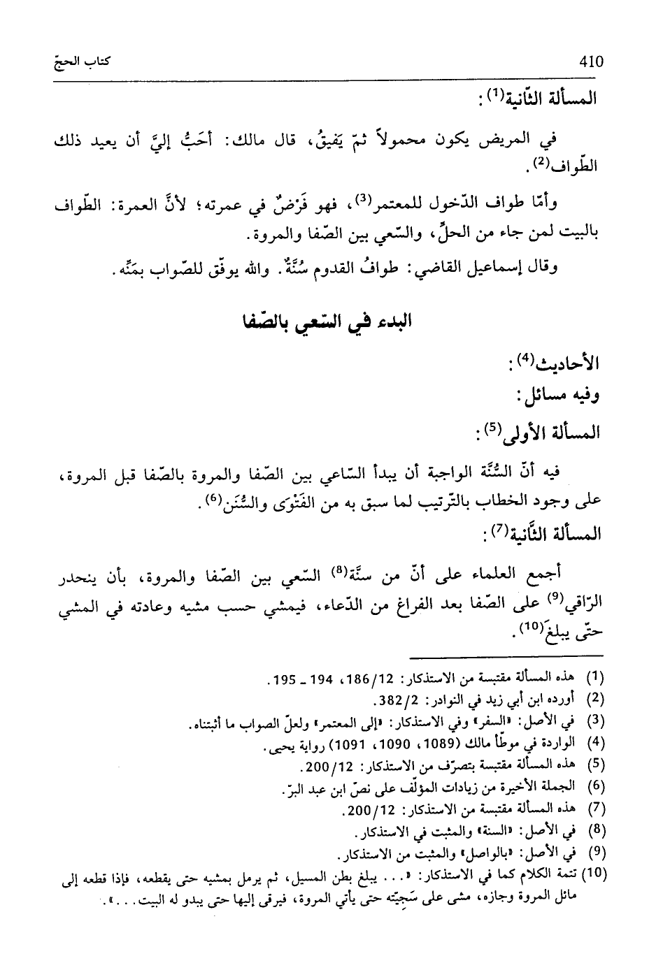 (¬10) تتمة الكلام كما في الاستذكار: " ... يبلغ بطن المسيل، ثمّ يرمل بمشيه حتّى يقطعه، فإذا قطعه إلى مائل المروة وجازه، مشى على سَجِيّته حتّى يأتي المروة، فيرقى إليها حتّى يبدو له البيت ... ".