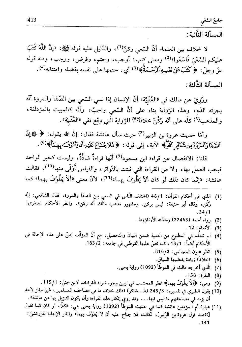(¬1) الّذي في أحكام القرآن: 1/ 48 (اختلف النَّاس في السعي بين الصفا والمروة، فقال الشّافعيّ: إنّه رُكْن، وقال أبو حنيفة: ليس بركن. ومشهور مذهب مالك أنّه ركن". وانظر الأحكام الصغرى: 1/ 34.