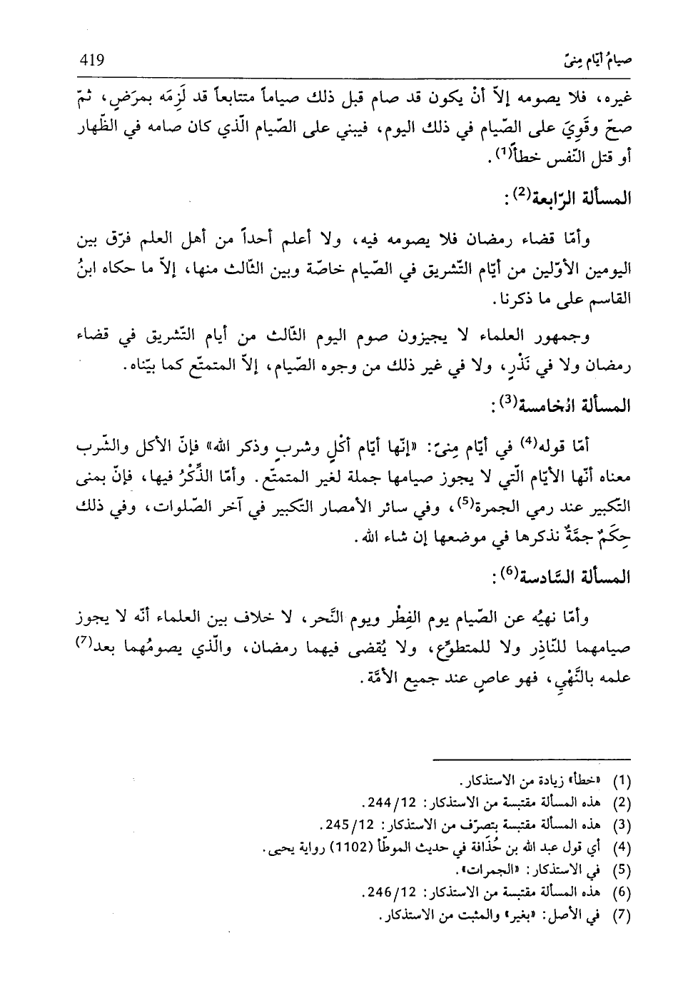 (¬6) هذه المسألة مقتبسة من الاستذكار: 12/ 246.