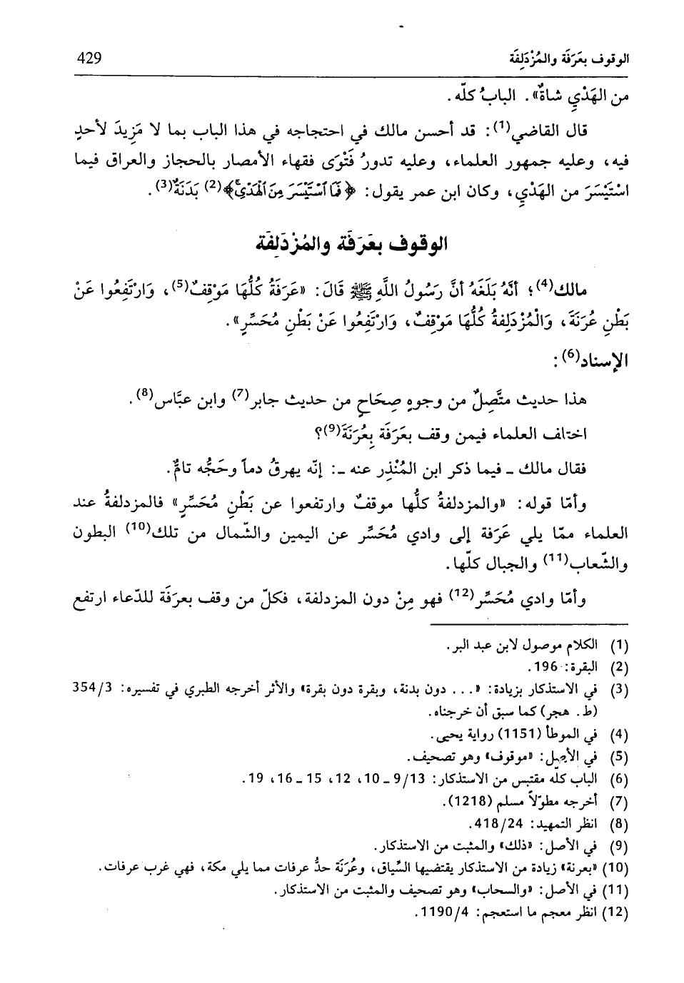 (¬10) "بعرنة" زيادة من الاستذكار يقتضيها السِّياق، وعُرَنَة حدُّ عرفات ممّا يلي مكّة، فهي غرب عرفات.