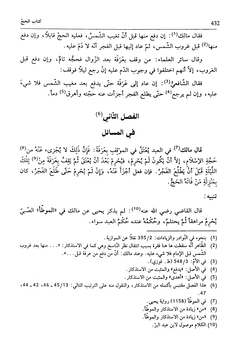 (¬2) الظّاهر أنّه سقطت هاهنا فقرة بسبب انتقال نظر النّاسخ وهي كما في الاستذكار: " ... منها بعد غروب الشّمس قبل الإمام فلا شيء عليه. وعند مالك: أنّ من دفع من عرفة قبل ... ".