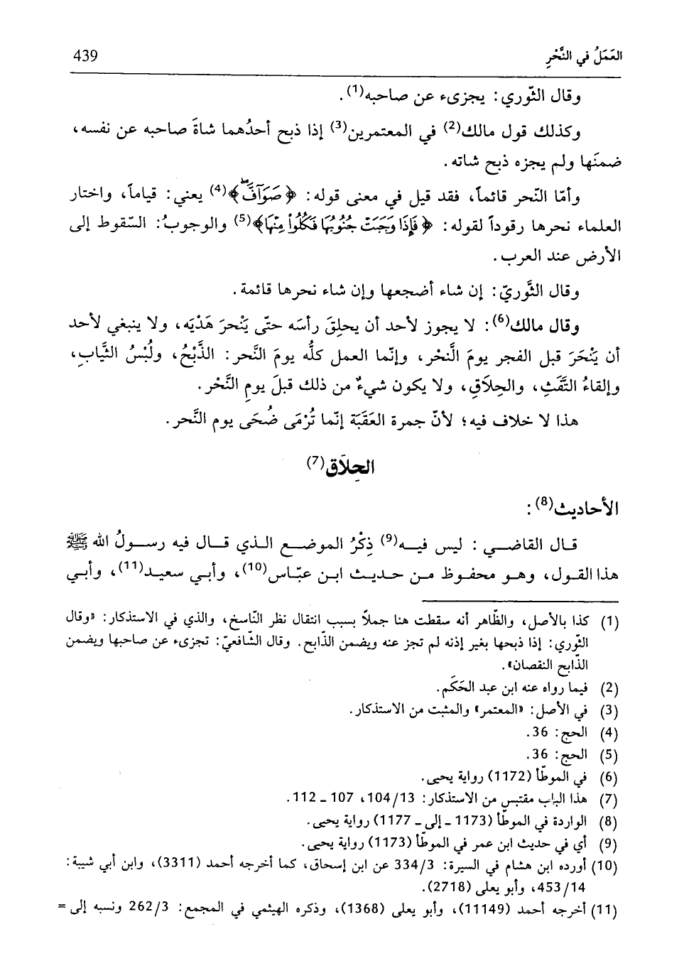 (¬1) كذا بالأصل، والظّاهر أنّه سقطت هنا جملًا بسبب انتقال نظر النّاسخ، والذي في الاستذكار: "وقال الثّوري: إذا ذبحها بغير إذنه لم تجز عنه ويضمن الذّابح. وقال الشّافعيّ: تجزئ عن صاحبها ويضمن الذّابح النقصان".