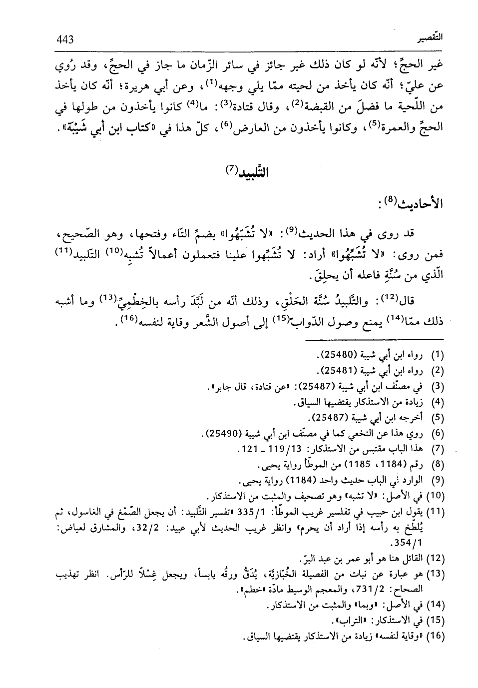 (¬11) يقول ابن حبيب في تفسير غريب الموطّأ: 1/ 335 "تفسير التَّلبيد: أنّ يجعل الصّمْغ في الغاسول، ثمّ يُلطّخ به رأسه إذا أراد أنّ يحرم" وانظر غريب الحديث لأبي عبيد: 2/ 32، والمشارق لعياض: 1/ 354.