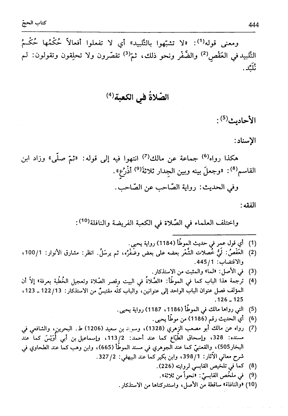 (¬4) ترجمة هذا الباب كما في الموطّأ: "الصَّلاةُ في البيت وقصر الصّلاة وتعجيل الخُطبة بعرفة" إِلَّا أنّ المؤلِّف فصل عنوان الباب الواحد إلى عنوانين، والباب كلّه مقتبسٌ من الاستذكار: 13/ 122 - 123، 125 - 126.
