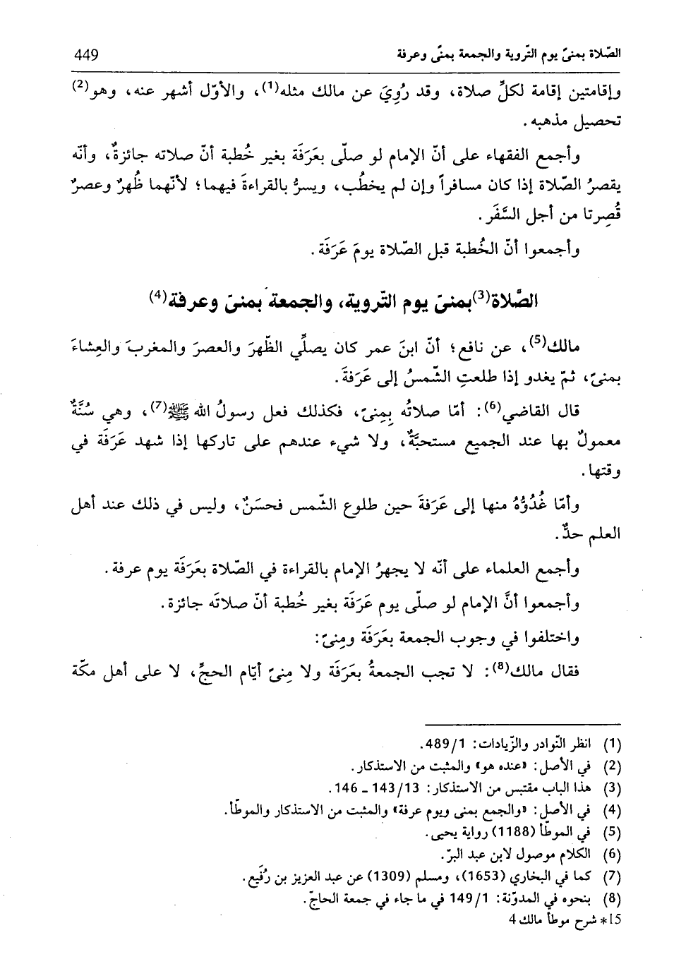 (¬4) في الأصل: " والجمع بمنى ويوم عرفة" والمثبت من الاستذكار والموطّأ.