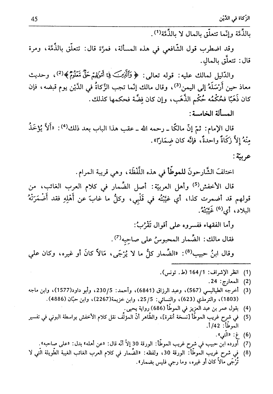 (¬8) في شرح غريب الموطّأ: الورقة 30، ولفظه: "الضِّمار في كلام العرب الغائب الغيبة الطّويلة الّتي لا تُرْجَى مالًا كان أو غيره، وما رجي فليس بضمار".