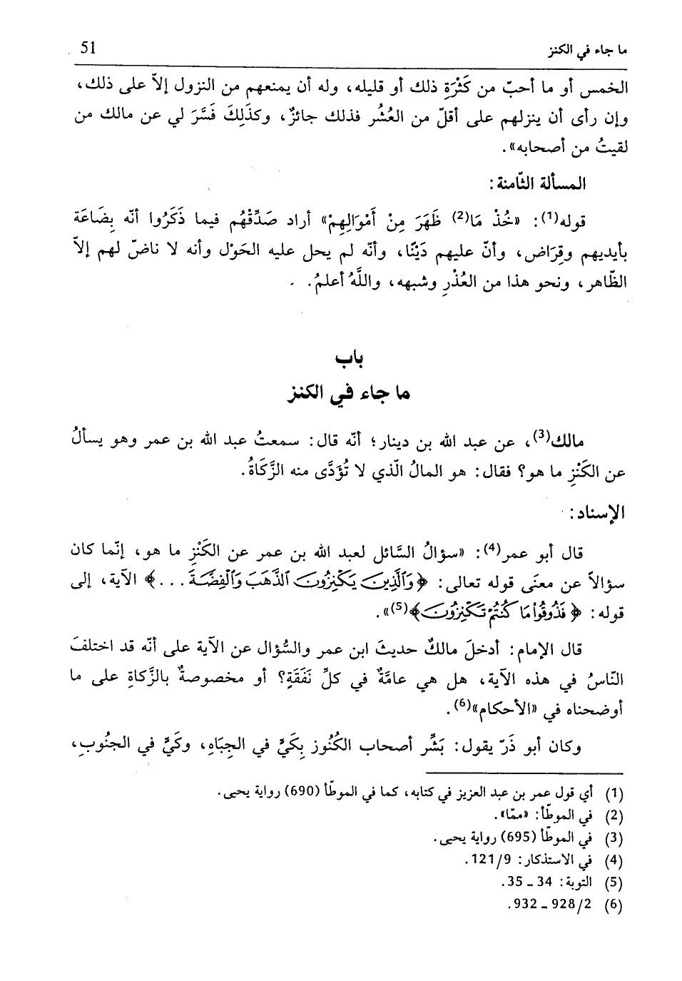 قال أبو عمر (¬4): "سؤالُ السَّائل لعبد الله بن عمر عن الكَنْزِ ما هو، إنّما كان سؤالًا عن معنَى قوله تعالى: {وَالَّذِينَ يَكْنِزُونَ الذَّهَبَ وَالْفِضَّةَ ...} الآية، إلى قوله: {فَذُوقُوا مَا كُنْتُمْ تَكْنِزُونَ} (¬5) ".
