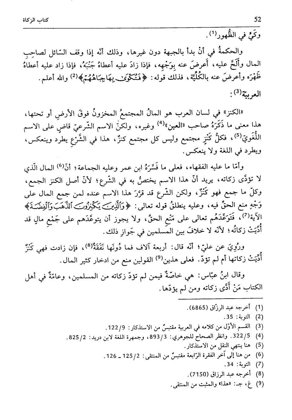 وأمّا ما عليه الفقهاء، فعلى ما فَسَّرَهُ ابن عمر وعليه الجماعة؛ أنّ (¬6) المال الّذي لا تؤدَّى زكاته، يريد أنّ هذا الاسم يختصُّ به في الشّرع؛ لأنّ أصل الكنز الجمع، وكلّ ما جمع فهو كَنْزٌ، ولكن الشّرع قد قرَّرَ هذا الاسم عنده لمن جمع المال على وَجْهِ منع الحقِّ فيه، وعليه ينطلقُ قوله تعالى: {وَالَّذِينَ يَكْنِزُونَ الذَّهَبَ وَالْفِضَّةَ} الآية (¬7)، فَتَوَعَّدَهُم تعالى على مَنْعِ الحقِّ، ولا يجوز أنّ يتوعَّدَهم على جَمْعِ مالٍ قد أُدِّيَتْ زكاتُه؛ لأنّه لا خلافَ بين المسلمين في جَوازِ ذلك.