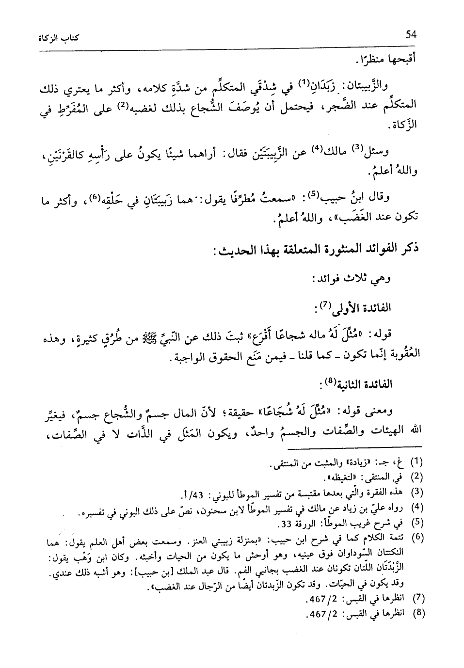 (¬6) تتمة الكلام كما في شرح ابن حبيب: "بمنزلة زبيبتي العنز. وسمعت بعض أهل العلّم يقول: هما النكتتان السّوداوان فوق عينيه، وهو إوحش ما يكون من الحيات وأخبثه. وكان ابن وَهْب يقول: الزَّبْدَتَان اللّتان تكونان عند الغضب بجانبي الفم. قال عبد الملك [بن حبيب]: وهو أشبه ذلك عندي. وقد يكون في الحيّات. وقد تكون الزّبدتان أيضًا من الرِّجال عد الغضب".
