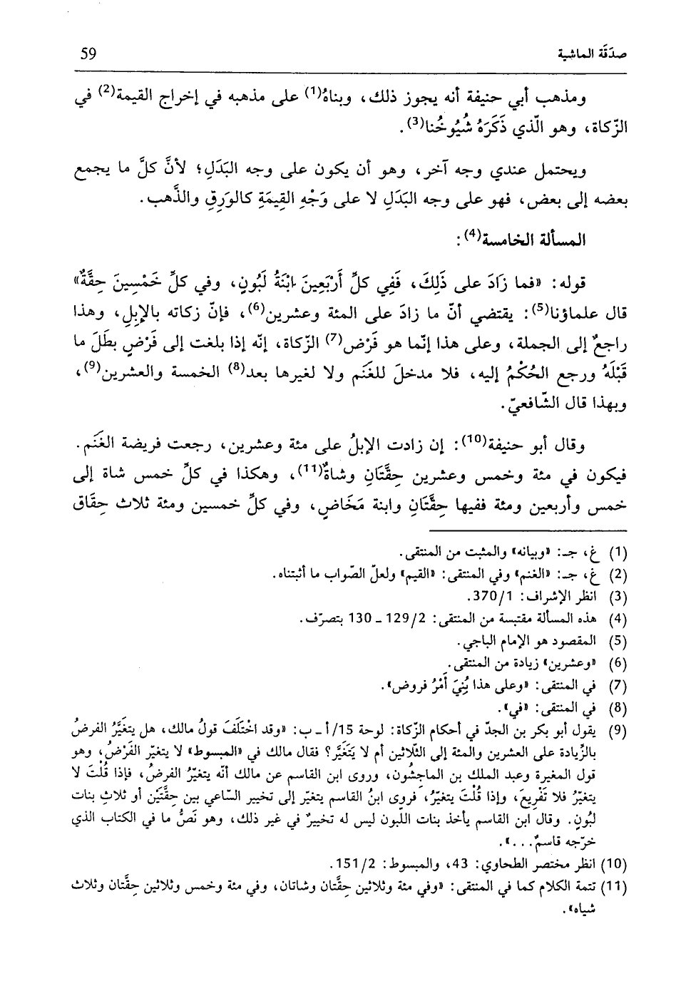 (¬9) يقول أبو بكر بن الجدّ في أحكام الزّكاة: لوحة 15/ أ - ب: "وقد اخْتَلَفَ قولُ مالكٌ، هل يتغَيَّرُ الفرضُ بالزِّيادة على العشرين والمئة إلى الثّلاثين أم لا يَتَغَيَّر؟ فقال مالك في "المبسوط" لا يتغيّر الفَرّضُ، وهو قول المغيرة وعبد الملك بن الماجشُون، وروى ابن القاسم عن مالكٌ أنّه يتغيّرُ الفرضُ، فإذا قُلْتَ لا يتغيّرُ فلا تَفْرِيعَ، وإذا قُلْتَ يتغيَّرُ، فروى ابنُ القاسم يتغيّر إلى تخيير السّاعي بين حِقَّتَين أو ثلاثِ بنات لبُونٍ. وقال ابن القاسم يأخذ بنات اللبون ليس له تخييرٌ في غير ذلك، وهو نَصُّ ما في الكتاب الّذي خرّجه قاسمٌ ... ".