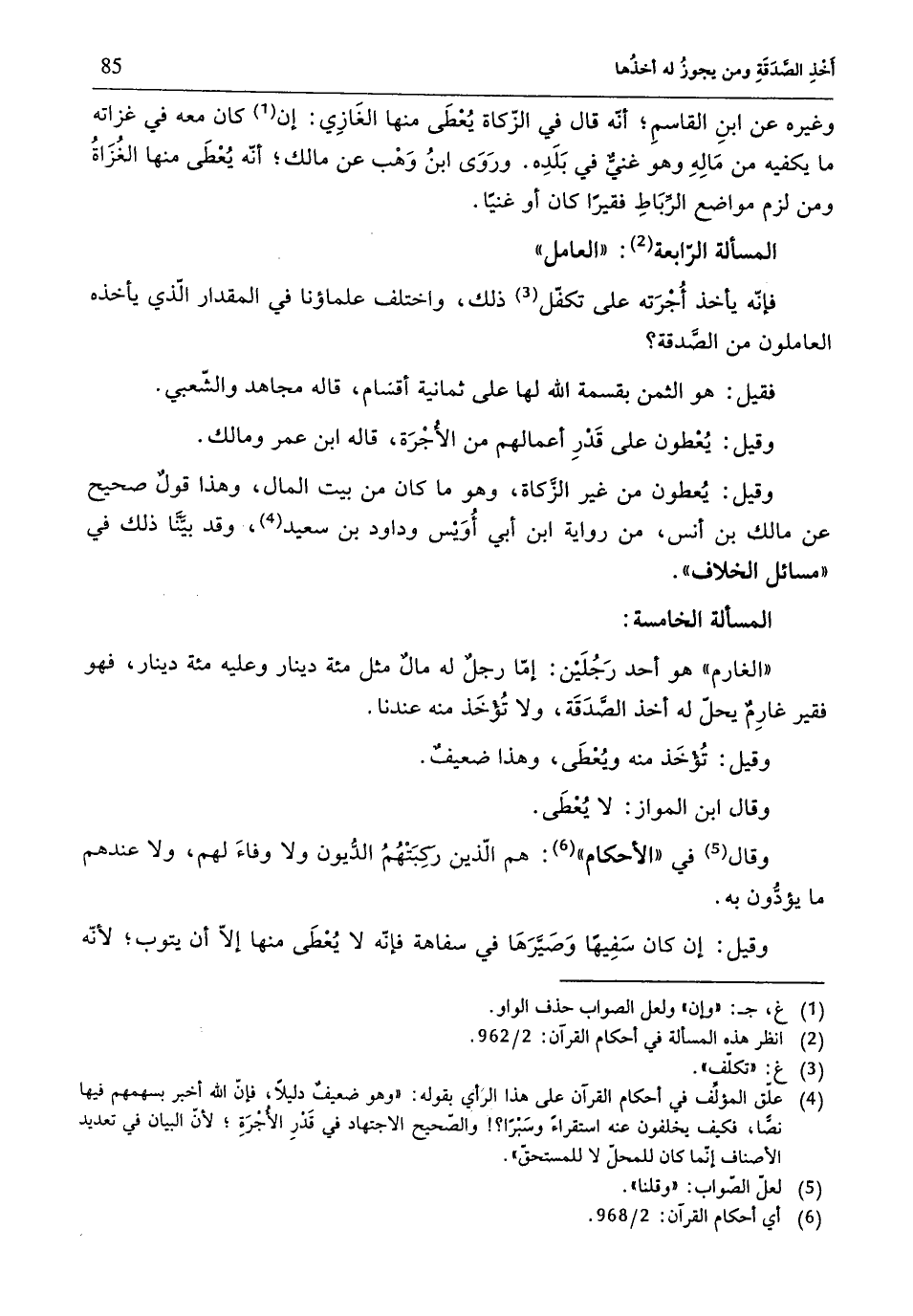 (¬4) علّق المؤلِّف في أحكام القرآن على هذا الرَأي بقوله: "وهو ضعيفٌ دليلًا، فإن الله أخبر بسهمهم فيها نضًّا، فكيف يخلفون عنيما استقراءً وسَبْرًا؟! والصّحيح الاجتهاد في قَدْرِ إلأُجرَةِ؛ لأنّ الييان في تعديد الأصناف إنّما كان للمحلّ لا للمستحقّ".