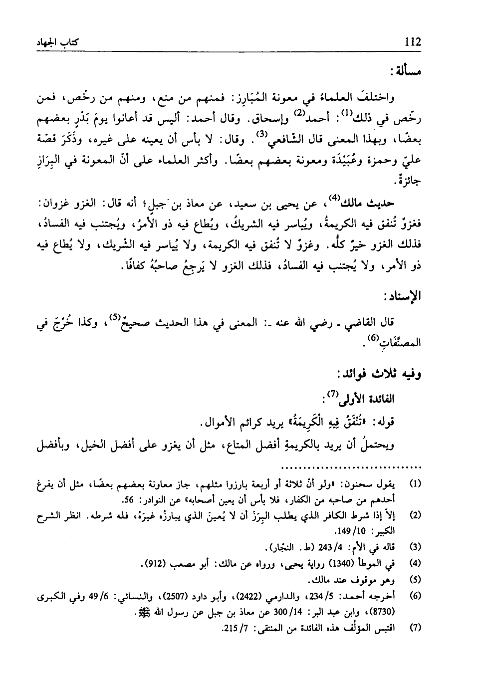 (¬1) بقول سحنون: "ولو أنّ ثلاثة أو أربعة بارزوا مثلهم، جاز معاونة بعضهم بعضًا، مثل أنّ يفرغ احدهم من صاحبه من الكفار، فلا بأس أنّ يعين أصحابه" عن النوادر: 56.