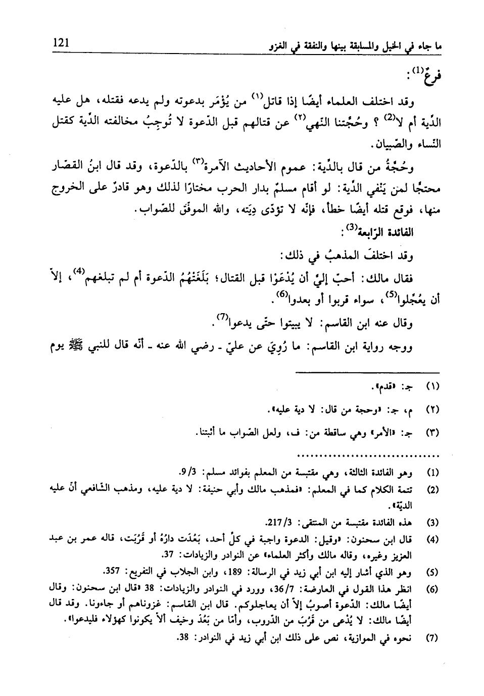 (¬6) انظر هذا القول في العارضة: 7/ 36، وورد في النوادر والزيادات: 38 "قال ابن سحنون: وقال أيضًا مالك: الدّعوة أصوبُ إِلَّا أنّ يعاجلوكلم. قال ابن القاسم: غزوناهم أو جاءونا. وقد قال أيضّا مالك: لا يُدْعى من قَرُبَ من الدّروب، وأمّا من بَعُدَ وخيف إِلَّا يكونوا كهؤلاء فليدعوا".