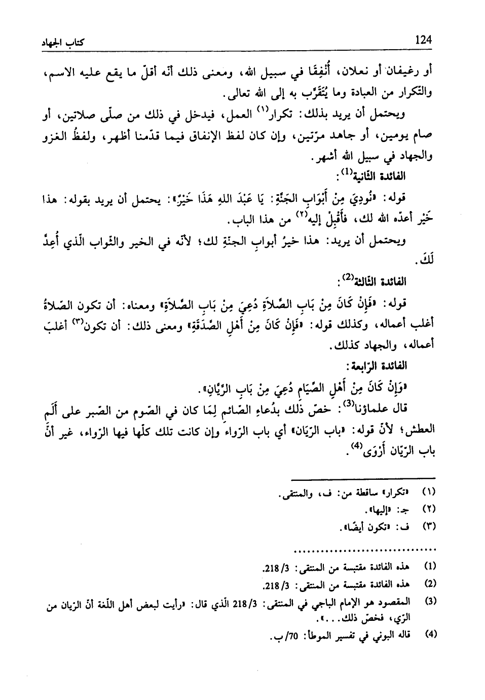 قول: "فَإِن كَانَ من بَابِ الصَّلاةِ دُعِيَ من بَابِ الصَّلَاةِ" ومعناه: أنّ تكون الصّلاةُ أغلب أعماله، وكذلك قوله: "فَإِنْ كَانَ مِنْ أَهْلِ الصَّدَقَةِ" ومعنى ذلك: أنّ تكون أغلبَ أعماله، والجهاد كذلك.