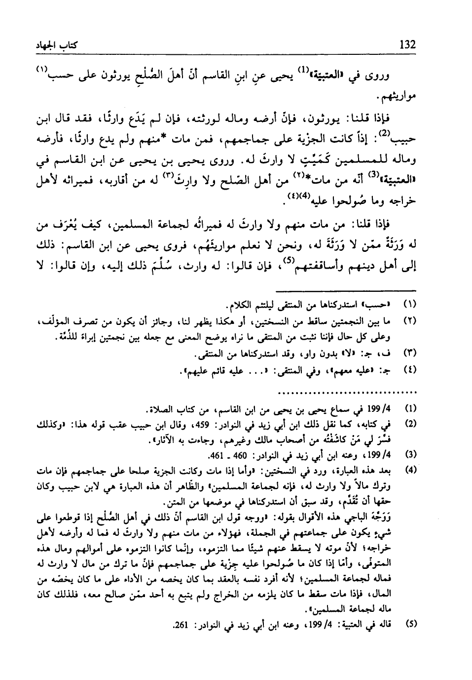 (¬4) بعد هذه العبارة، ورد في النسختين: "وأمّا إذا مات وكانت الجزية صلحا على جماجمهم فإن مات وترك مالًا ولا وارث له، فإنّه لجماعة المسلمين، والظّاهر أنّ هذه العبارة هي لابن حبيب وكان حقها أنّ تُقدَّم، وقد سبق أنّ استدركناها في موضعها من المتن.