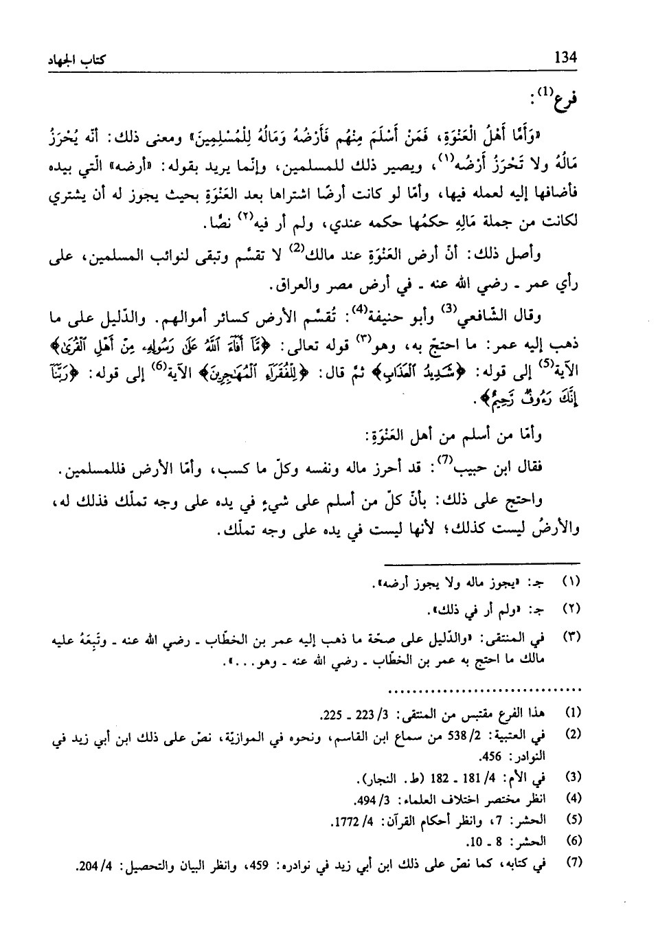 وأصل ذلك: أنّ أرض العَنْوَةِ عند مالك (¬2) لا تقسَّم وتبقى لنوائب المسلمين، على رأي عمر - رضي الله عنه - في أرض مصر والعراق.