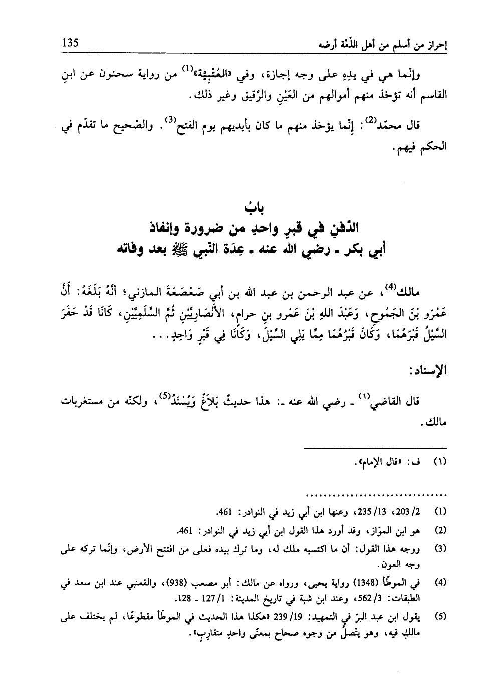 (¬4) في الموطَّأ (1348) رواية يحيى، ورواه عن مالك: أبو مصعب (938)، والقعنبي عند ابن سعد في الطبقات: 3/ 562، وعند ابن شبة في تاريخ المدينة: 1/ 127 - 128.