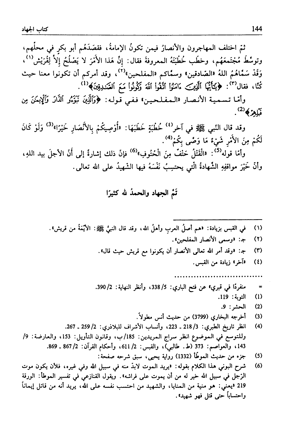 (¬6) شرح البوني هذا الكلام بقوله: "يريد الموت لا بدّ منه في سبيل الله وفي غيره، فلأن يكون موت الرَّجل في سبيل الله خير له من أنّ يموت على فراشه". ويقول القنازعي في تفسير الموطَّأ: الورقة 219 "يعني: هو منية من المنايا، والشهيد من احتسب نفسه على الله، يريد أنّه من قاتل إيمانًا واحتسابًا حتّى قتل فهو شهيد".