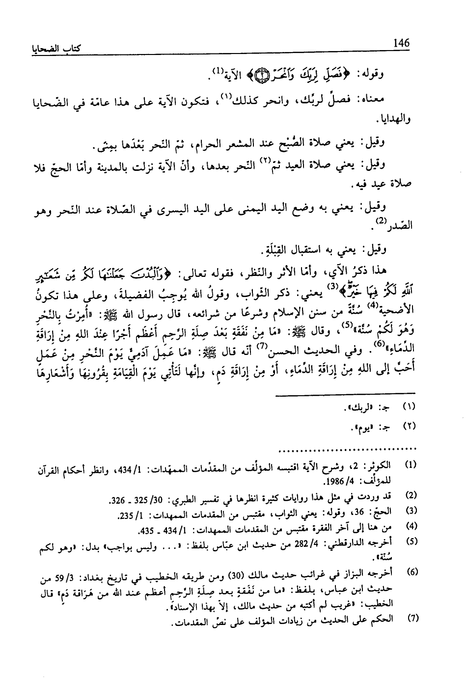 (¬1) الكوثر: 2، وشرح الآية اقتبسه المؤلِّف من المقدِّمات الممهدات: 1/ 434، وانظر أحكام القرآن للمؤلِّف: 4/ 1986.