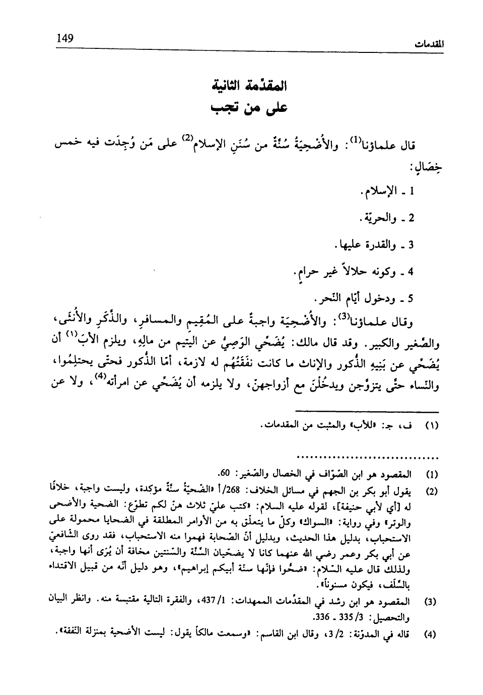 قال علماؤنا (¬1): والأُضْحِيةُ سُنَّةٌ من سُنَنِ الإسلام (¬2) على مَنْ وُجدَت فيه خمس خصَالٍ: