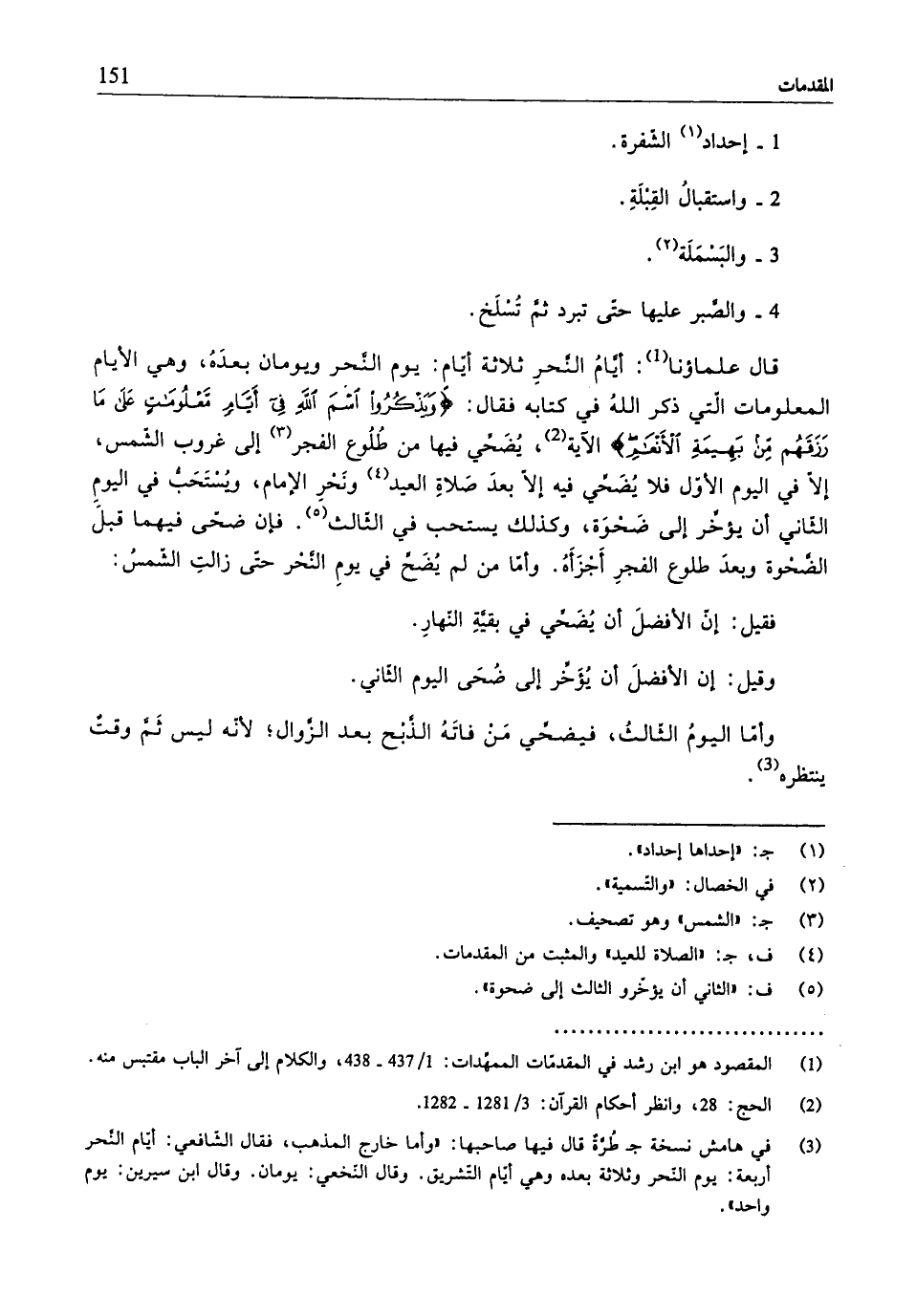 (¬3) في هامش نسخة جـ طُرَّةٌ قال فيها صاحبها: "وأمّا خارج المذهب، فقال الشّافعيّ: أيّام النَّحر أربعة: يوم النَّحر وثلاثة بعده وهي أيّام التّشريق. وقال النّخعي: يومان. وقال ابن سيرين: يوم واحد".