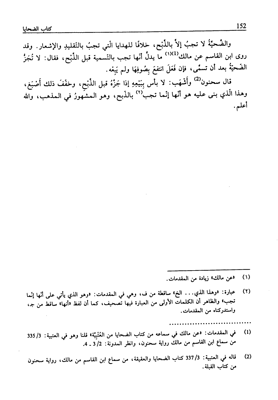 (¬1) في المقدِّمات: "عن مالك في ساعه من كتاب الضحايا من العُتْبيَّة" قلنا وهو في العتبية: 3/ 335 من سماع ابن القاسم من مالك رواية سحنون، وانظر المدوّنة: 2/ 3 - 4.