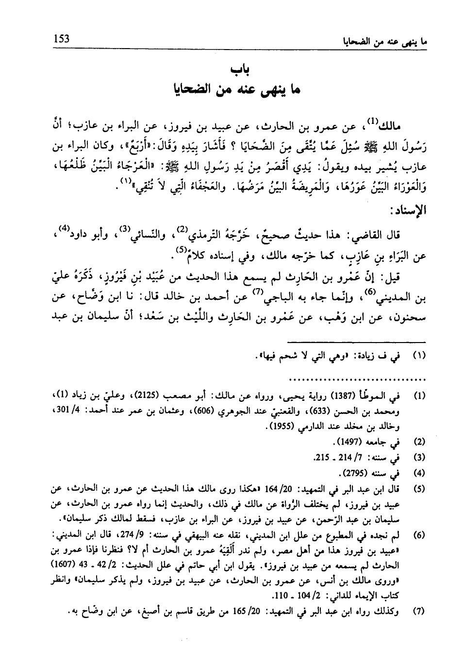 مالك (¬1)، عن عمرو بن الحارث، عن عبيد بن فيروز، عن البراء بن عازب؛ أنَّ رَسُولَ اللهِ - صلّى الله عليه وسلم - سُئِل عَمَّا يُتَّقَى مِنَ الضَّحَايَا؟ فَأَشَارَ بِيَدِهِ وَقَال: "أَربَعٌ"، وكان البراء بن عازب يُشير بيده ويقولُ: يَدِي أَقصَرُ من يَدِ رَسُولِ اللهِ - صلّى الله عليه وسلم -: "العَرْجَاءُ البَيِّنُ ظَلعُهَا، وَالعَوْرَاءُ البَيِّنُ عَوَرُهَا، وَالمَرِيضَةُ البيِّنُ مرَضُها. والعَجْفَاءُ الّتي لا تُنقِي".