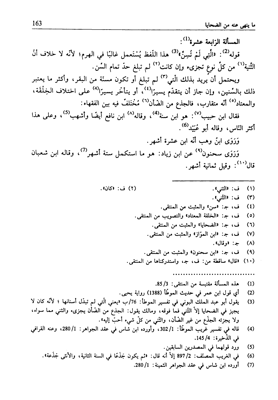 (¬3) يقول أبو عبد الملك البوني في تفسير الموطَّأ: 76/ ب "يعني الّتي لم تبدل أسنانّها؛ لأنّه كان لا يجيز في الضحايا إلّا الثَّني فما فوقه، ومالك يقول: الجذع من الضّأن يجزئ والثني ممّا سواه، ولا يجزئه الجذَع من غير الضَأن، والثَني من كلّ شيء أحبَ إليه".