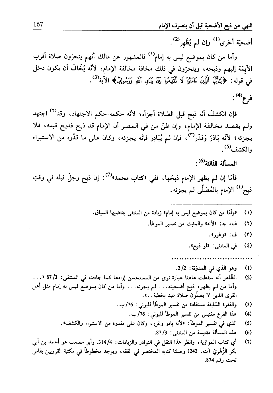 وأمّا من كان بموضع ليس به إمام فالمشهور عن مالك أنّهم يتحرّون صلاة أقرب الأيِمّة إليهم وذبحه، ويتحرّون في ذلك مخافة مخالفة الإمام؛ لأنّه يُخَافُ أنّ يكون دخل في قوله: {يَا أَيُّهَا الَّذِينَ آمَنُوا لَا تُقَدِّمُوا بَيْنَ يَدَيِ اللَّهِ وَرَسُولِهِ} الآية (¬3).