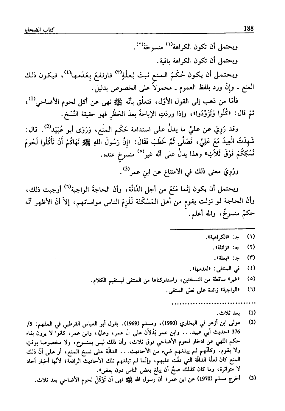 (¬3) أخرج مسلم (1970) عن ابن عمر؛ أنّ رسول الله - صلّى الله عليه وسلم - نهى أنّ تُؤكَلَ لحوم الأضاحي بعد ثلاث.