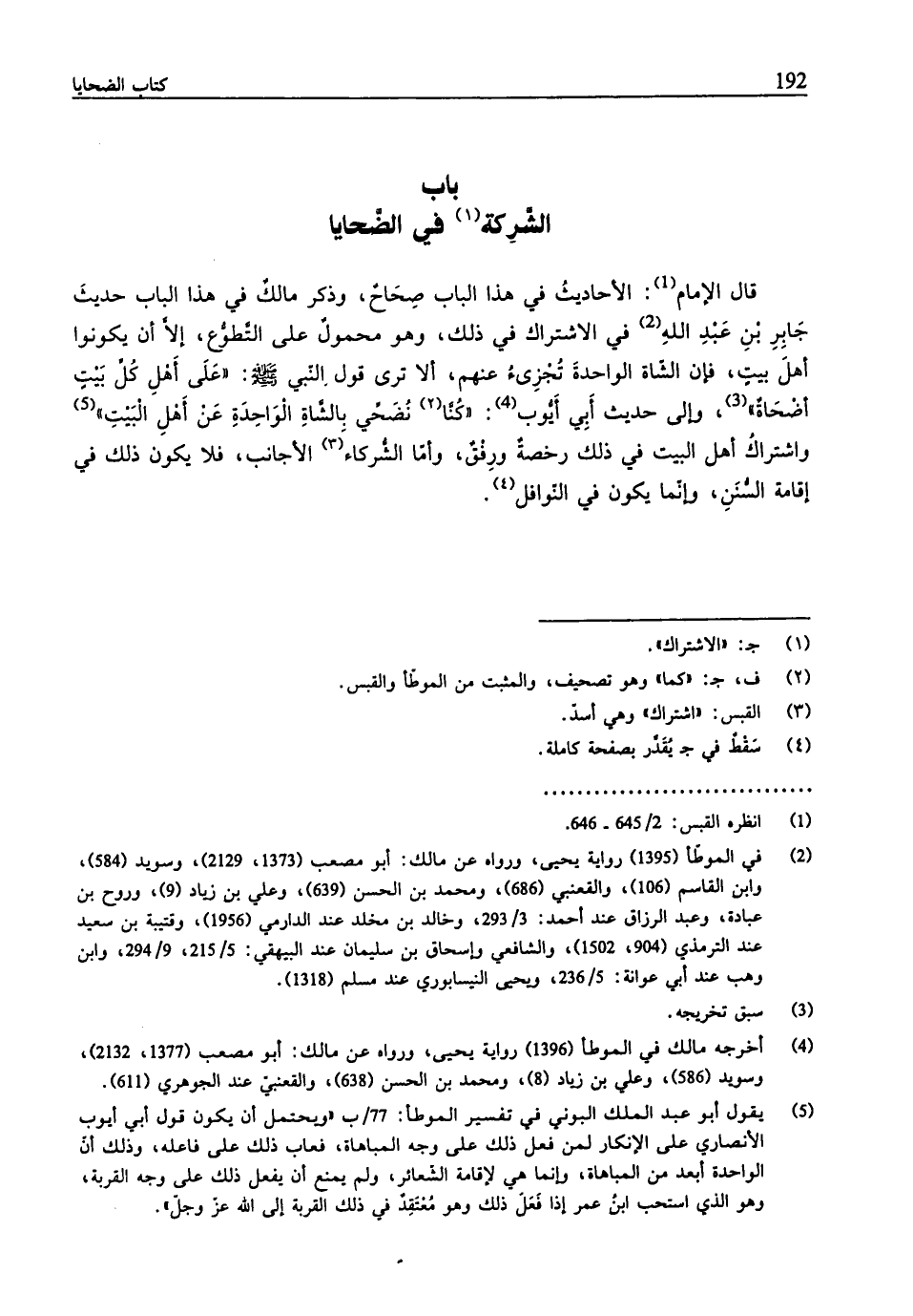 (¬5) يقول أبو عبد الملك البوني في تفسير الموطَّأ: 77/ ب "ويحتمل أنّ يكون قول أبي أيوب الأنصاري على الإنكار لمن فعل ذلك على وجه المباهاة، فعاب ذلك على فاعله، وذلك أنّ الواحدة أبعد من المباهاة وإنّما هي لإقامة الشّعائر، ولم يمنع أنّ يفعل ذلك على وجه القربة، وهو الّذي استحب ابنُ عمر إذا فعل ذلك وهو مُعْتقِدٌ في ذلك القربة إلى الله عَزَّ وَجَلَّ".
