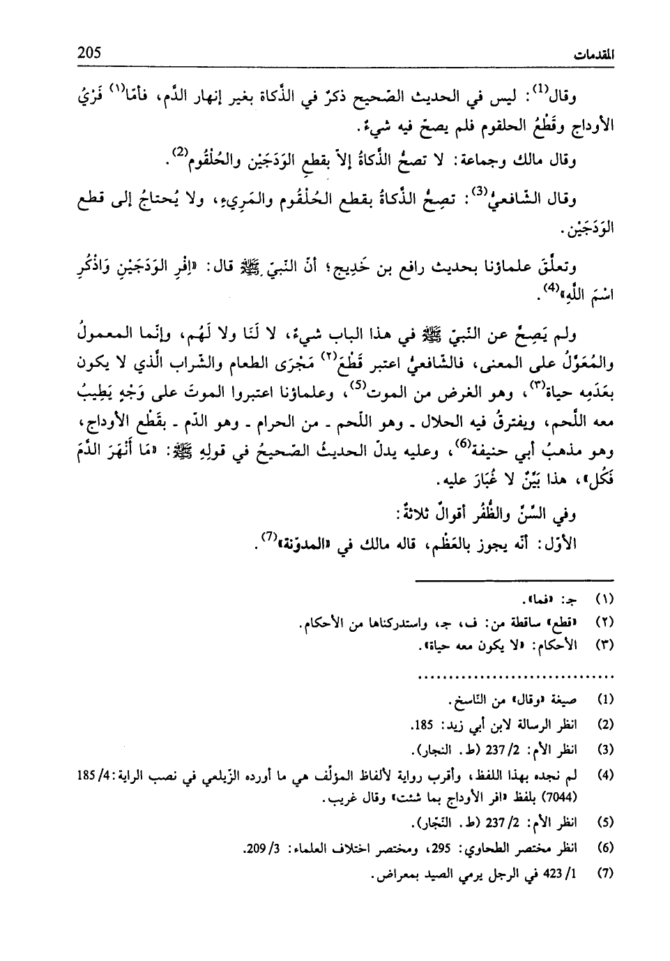 وتعلَّقَ علماؤنا بحديث رافع بن خَدِيج؛ أنّ النَّبيِّ - صلّى الله عليه وسلم - قال: "اِفْرِ الوَدَجَينِ وَاذكُرِ اسْمَ اللَّهِ" (¬4).