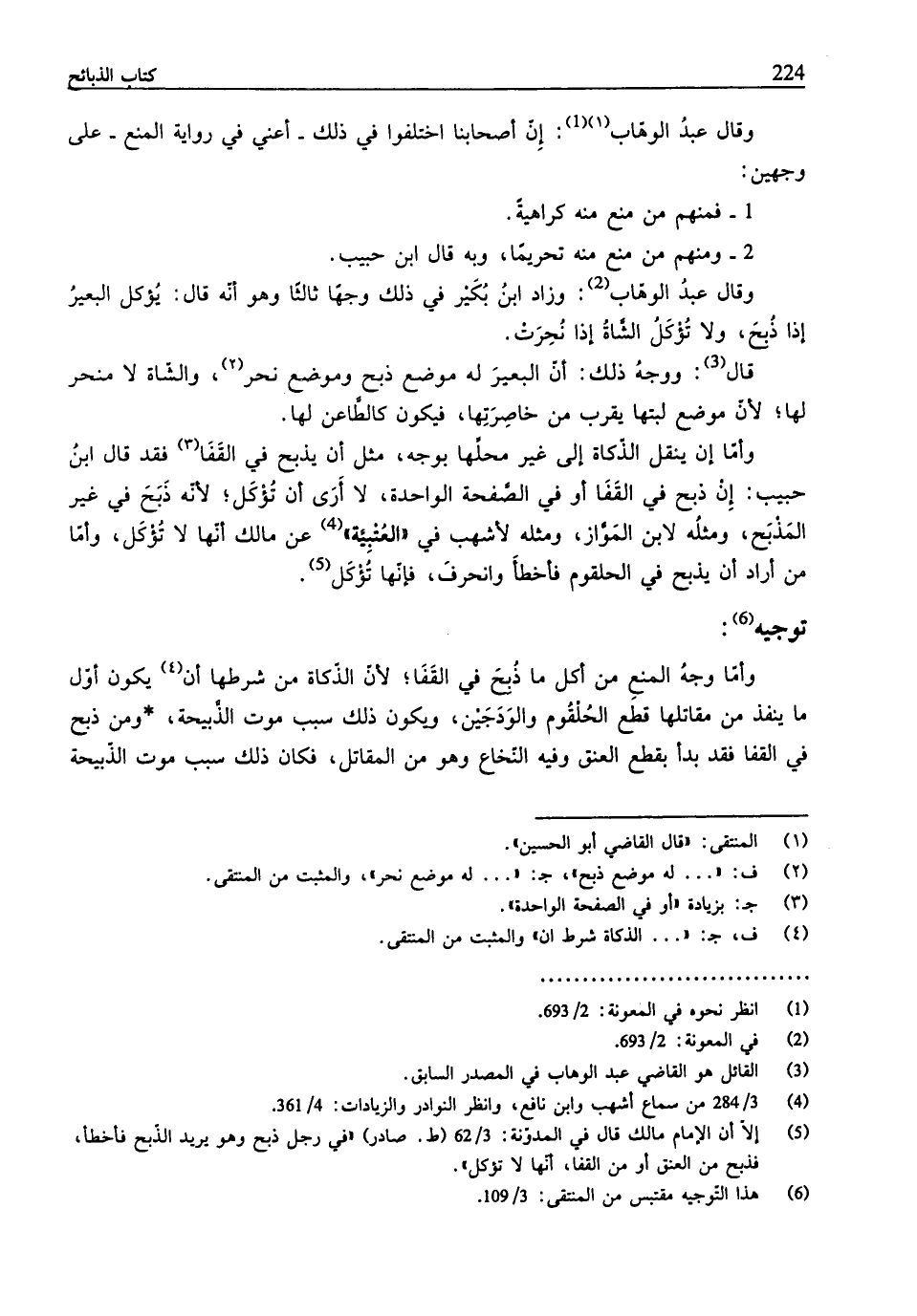(¬5) إِلَّا أنّ الإمام مالك قال في المدوّنة: 3/ 62 (ط. صادر) "في رجل ذبح وهو يريد الذَّبح فأخطأ، فذبح من العنق أو من القفا، أنّها لا تؤكل".