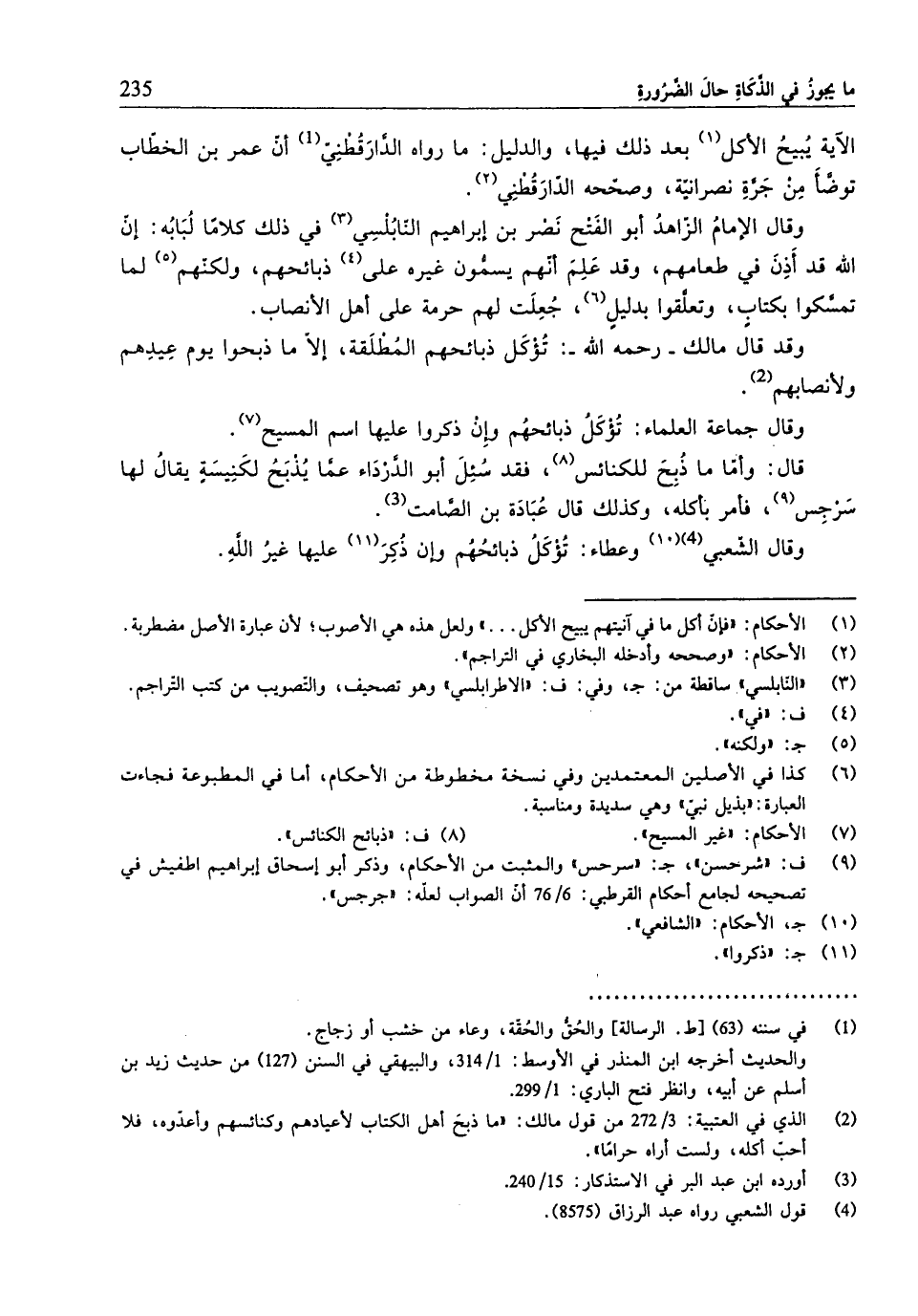 وقال الإمامُ الزاهدُ أبو الفَتح نَصْر بن إبراهيم النّابُلْسِي في ذلك كلامَا لُبَابُه: إنَّ الله قد أَذِنَ في طعامهم، وقد عَلِم أنّهم يسمون غيره على ذبائحهم، ولكنّهم لما تمسَّكوا بكتابٍ، وتعلَّقوا بدليلٍ، جُعِلَت لهم حرمة على أهل الأنصاب.