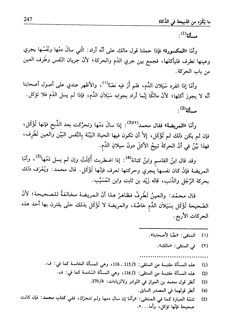 (¬5) تتمّة العبارة كما في المنتقى: "وأمّا إنَّ سأل دمها ولم تتحرّك، ففي كتاب محمّد: فإن كانت صحيحة فأنّها تؤكل، وأمّا ... ".