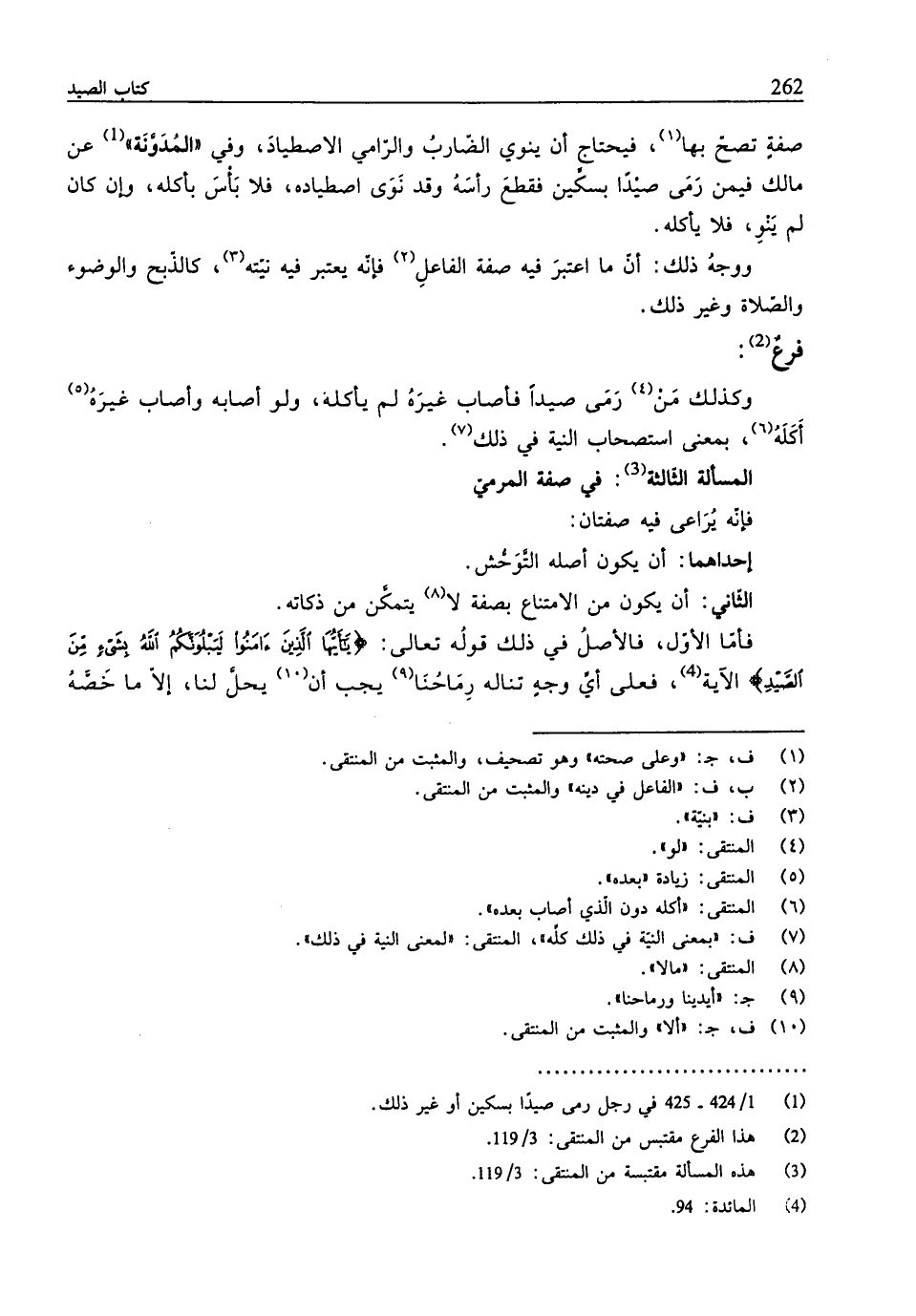 (¬1) 1/ 424 - 425 في رجل رمى صيدًا بسكين أو غير ذلك.