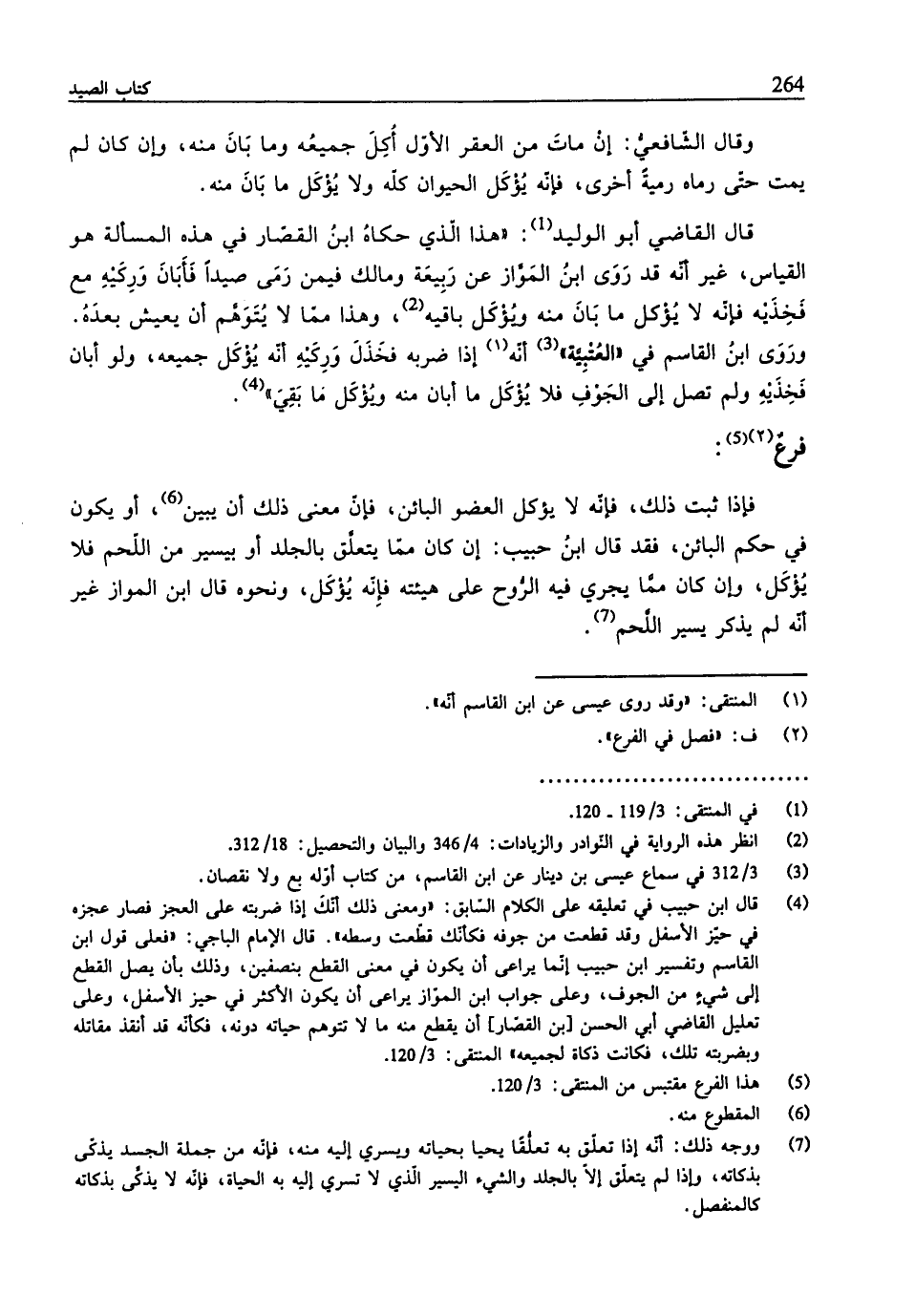 (¬4) قال ابن حبيب في تعليقه على الكلام السّابق: ومعنى ذلك أنك إذا ضربته على العجز فصار عجزه في حيّز الاسفل وقد قطمت من جوفه فكانّك قطّعت وسطه". قال الإمام الباجي: "فعلى قول ابن القاسم وتفسير ابن حبيب إنَّما يراعى أنّ يكون في معنى القطع بنصفين، وذلك بأن يصل القطع إلى شيءٍ من الجوف، وعلى جواب ابن الموّاز يراعى أنّ يكون أكثر ني حيز الاسفل، وعلى تعليل القاضي أبي الحسن [بن القصّار] أنّ يقطع منه ما لا تتوهم حياته دونه، فكأنّه قد أنقذ مقاتله وبضربته تلك، فكانت ذكاة لجميعه" المنتقى: 3/ 120.