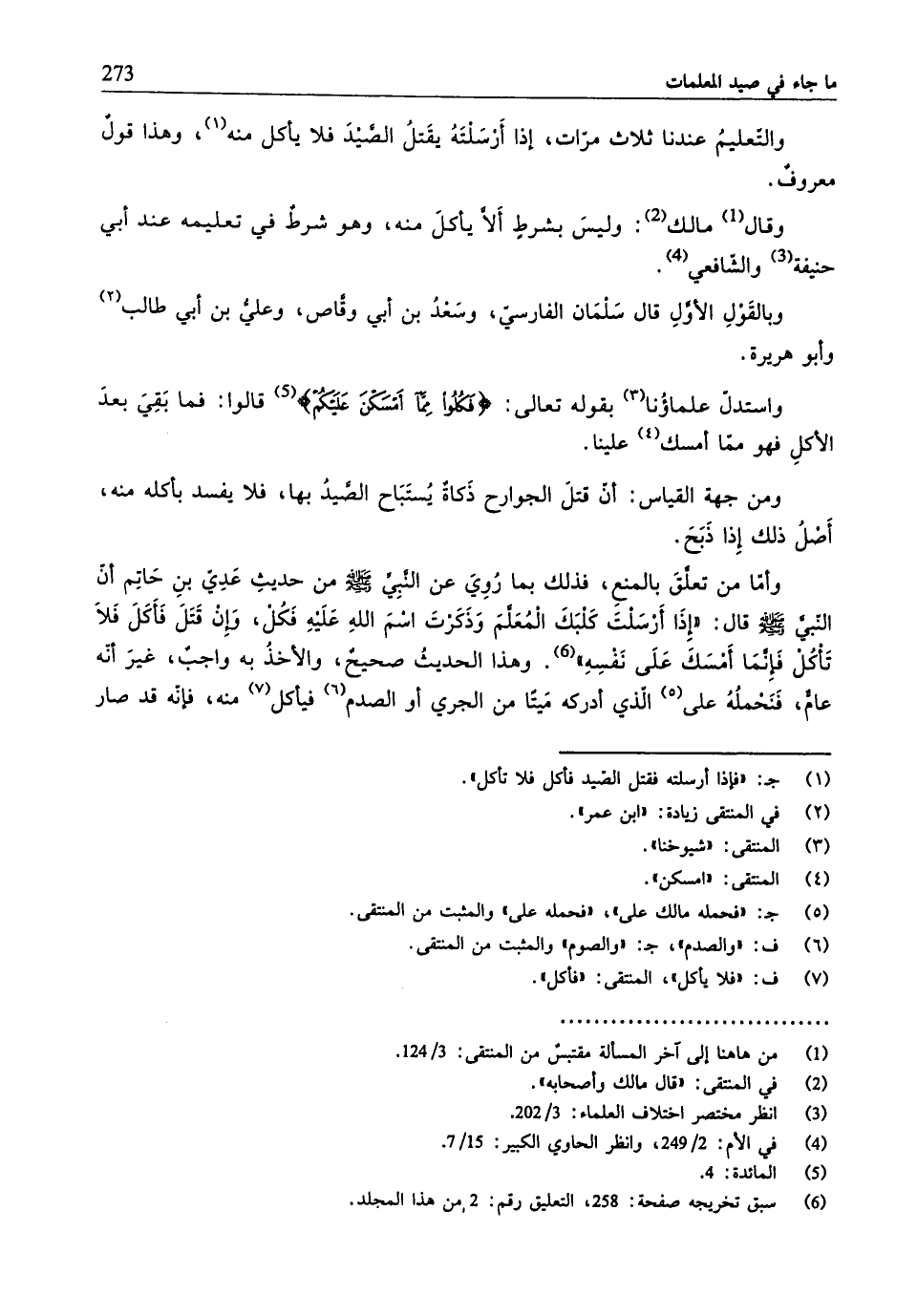 والتّعليمُ عندنا ثلاث مرَّات، إذا أَرسَلنَهُ يقَتلُ الصَّيدَ فلا يأكل منه، وهذا قولٌ معروفٌ.