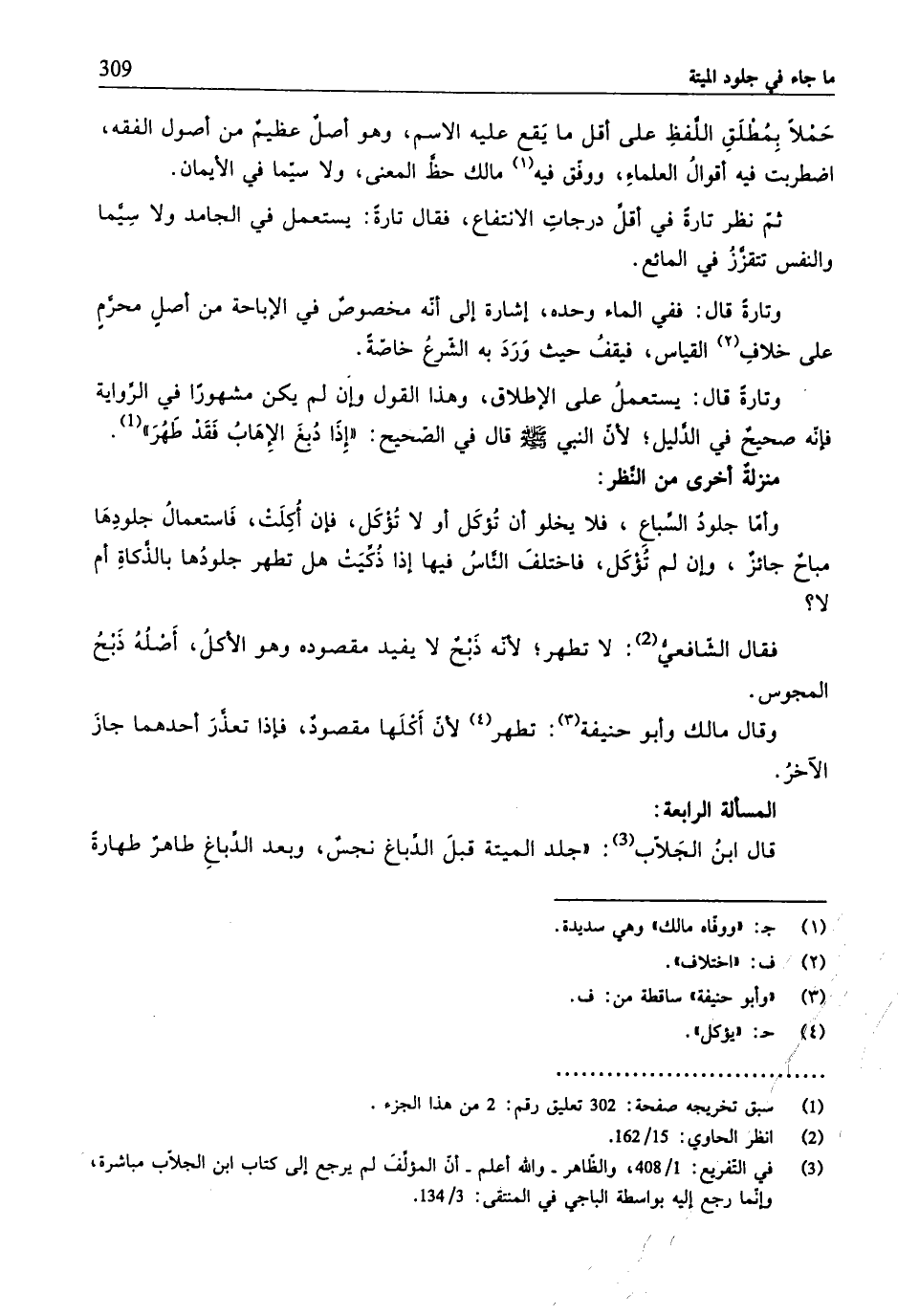 (¬3) في التفريع: 1/ 408، والظّاهر -والله أعلم- أنّ المؤلِّفَ لم يرجع إلى كتاب ابن الجلّاب مباشرة، وإنّما رجع إليه بواسطة الباجي في المنتقى: 3/ 134.