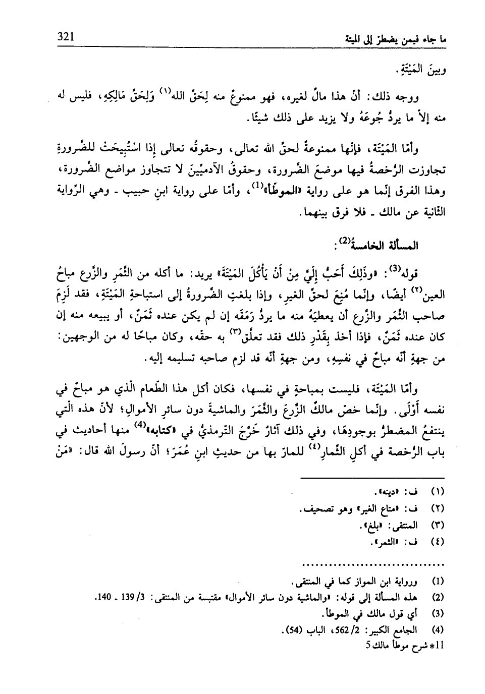 وأمّا المَيتة، فليست بمباحةٍ في نفسها، فكان أكل هذا الطّعام الّذي هو مباحٌ في نفسه أَوْلَى. وإنّما خصّ مالكٌ الزَّرعَ والثَّمَرَ والماشيةَ دون سائرِ الأموالِ؛ لأنّ هذه الّتي ينتفعُ المضطرُّ بوجودِهَا، وفي ذلك آثارٌ خَرَّج التّرمذيُّ في "كتابه" (¬4) منها أحاديث في باب الرُّخصة في أكل الثِّمارِ للمارّ بها من حديثِ ابنِ عُمَرَ؛ أنّ رسولَ الله - صلّى الله عليه وسلم - قال: "مَنْ