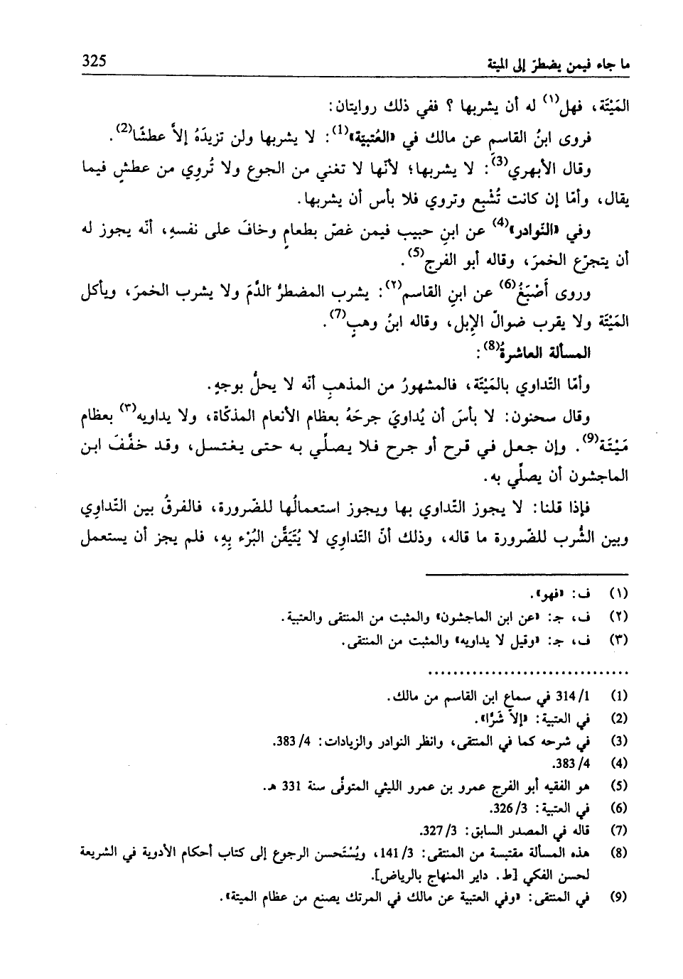 (¬8) هذ. المسألة مقتبسة من المنتقى: 3/ 141، ويُسْتَحسن الرجوع إلى كتاب أحكام الأدوية في الشّريعة لحسن الفكي [ط. داير المنهاج بالرياض].
