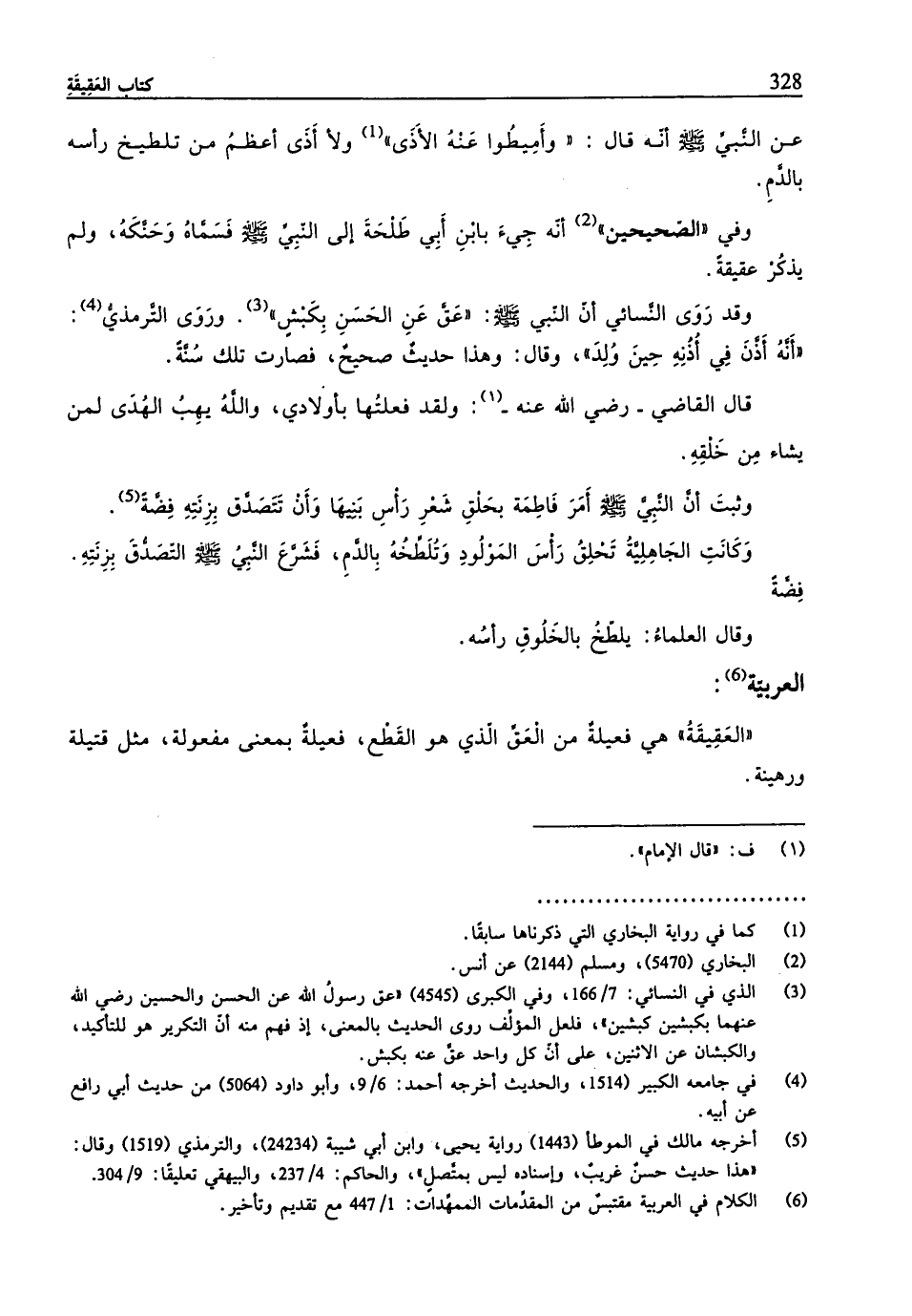 وقد روَى النَّسائي أنّ النّبيّ - صلّى الله عليه وسلم -:"عَقَّ عَنِ الحَسَنِ بِكَبْشِ (¬3). ورَوَى التَّرمذيُّ (¬4): "أَنَّهُ أَذَّنَ في أُذُنِهِ حِينَ وُلِدَ"، وقال: وهذا حديثٌ صحيحٌ، فصارت تلك سُنَّةً.