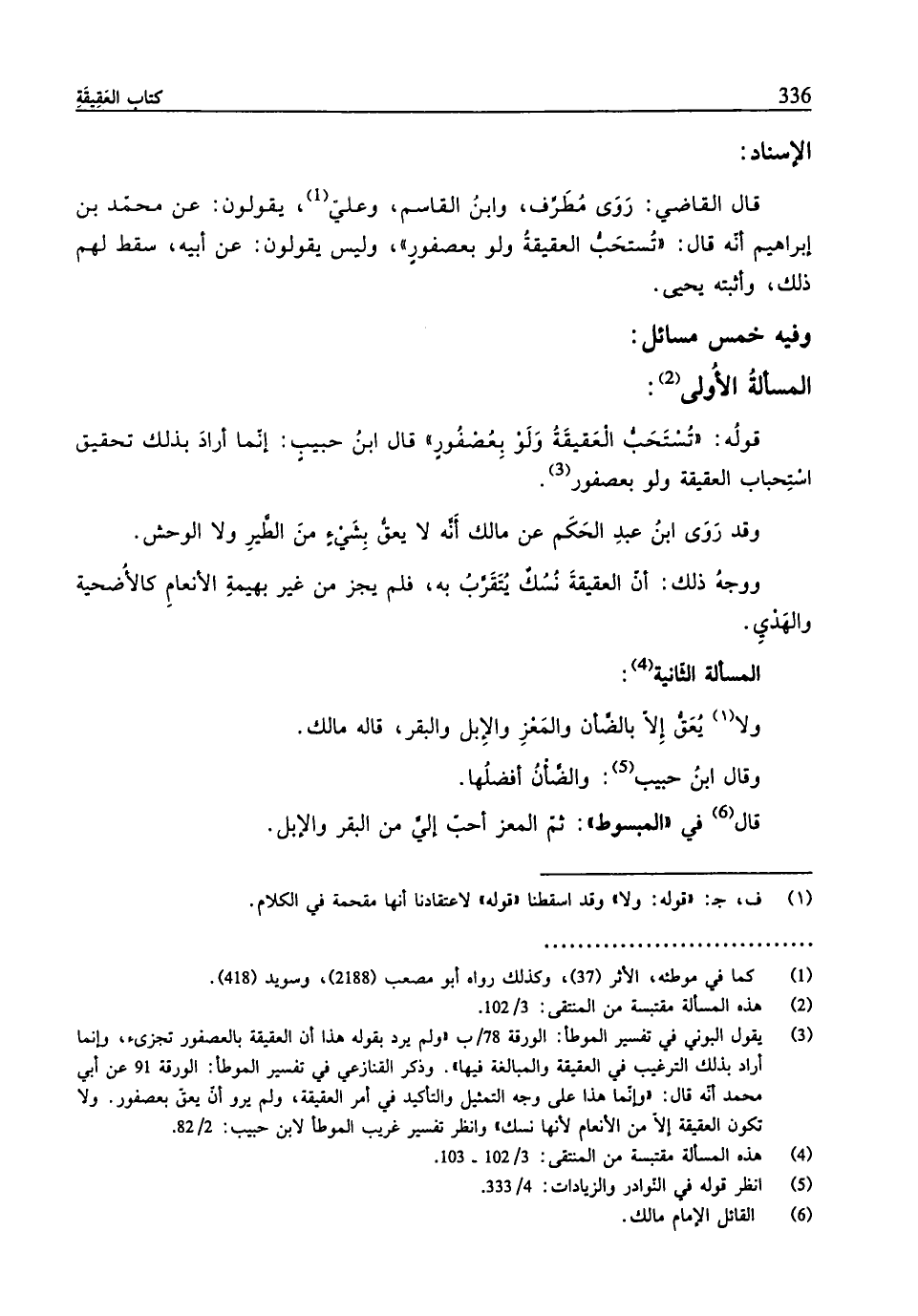 (¬3) يقول البوني في تفسير الموطَّأ: الورقة 78/ ب ولم يرد بقوله هذا أنّ العقيقة بالعصفور تجزئ، وإنّما أراد بذلك الترغيب في العقيقة والمبالغة فيها". وذكر القنازعي في تفسير الموطَّأ: الورقة 91 عن أبي محمّد إنّه قال: "وإنّما هذا على وجه التمثيل والتاكيد في أمر العقيقة، ولم يرو أنّ يعقّ بعصفور. ولا تكون العقيقة إِلَّا من الأنعام لأنّها نسك" وانظر تفسير غريب الموطَّأ لابن حبيب: 2/ 82.