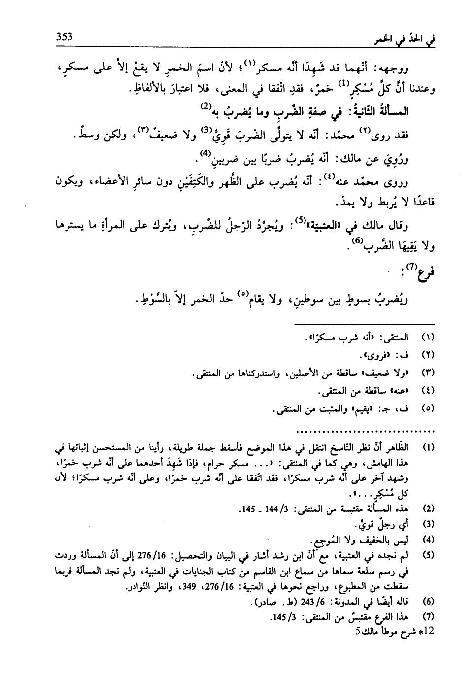 (¬1) الظّاهر أنّ نظر النّاسخ انتقل في هذا الموضع فأسقط جملة طويلة، رأينا من المستحسن إثباتها في هذا الهامش، وهي كما في المنتقى: " ... مسكر حرام، فهذا شّهِدَ أحدهما على أنّه شرب خمرًا، وشهد آخر على أنّه شرب مسكرًا، فقد اتّفقا على أنّه شرب خمرًا، وعلى أنّه شرب مسكرًا؛ لأنّ كلّ مُسكِرٍ ... ".