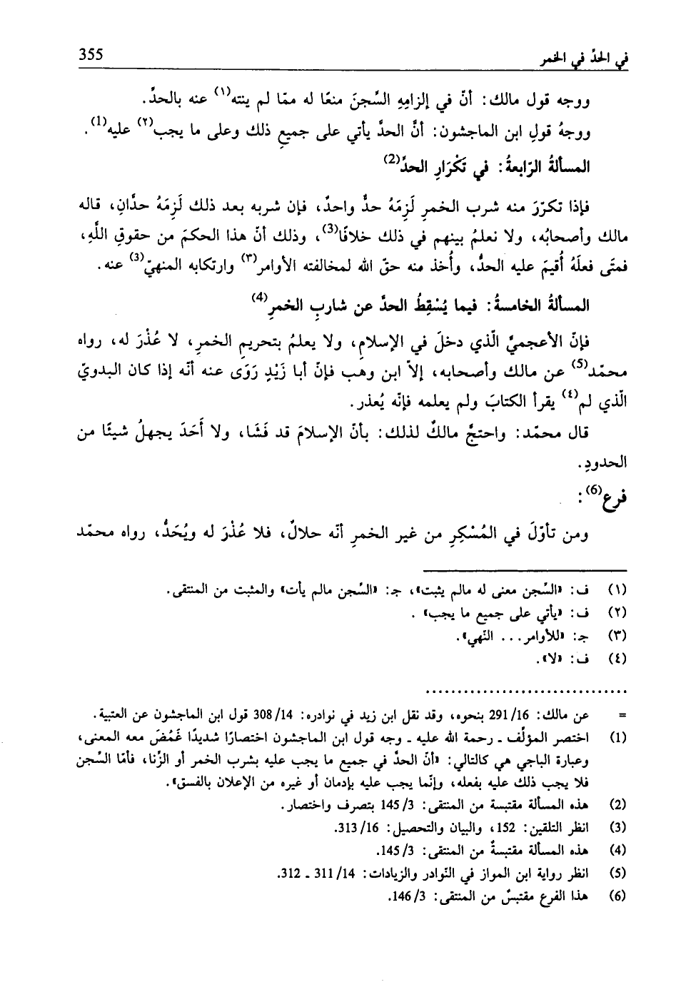 (¬1) اختصر المؤلِّف -رحمة الله عليه - وجه قول ابن الماجشون اختصارًا شديدًا غَمُضَ معه المعنى، وعبارة الباجي هي كالتالي: "أنّ الحدّ في جميع ما يجب عليه بشرب الخّمْرِ أو الزِّنا، فأمّا السِّجن فلا يجب ذلك عليه بفعله، وإنّما يجب عليه بإدمان أو غيره من الإعلان بالفسق".