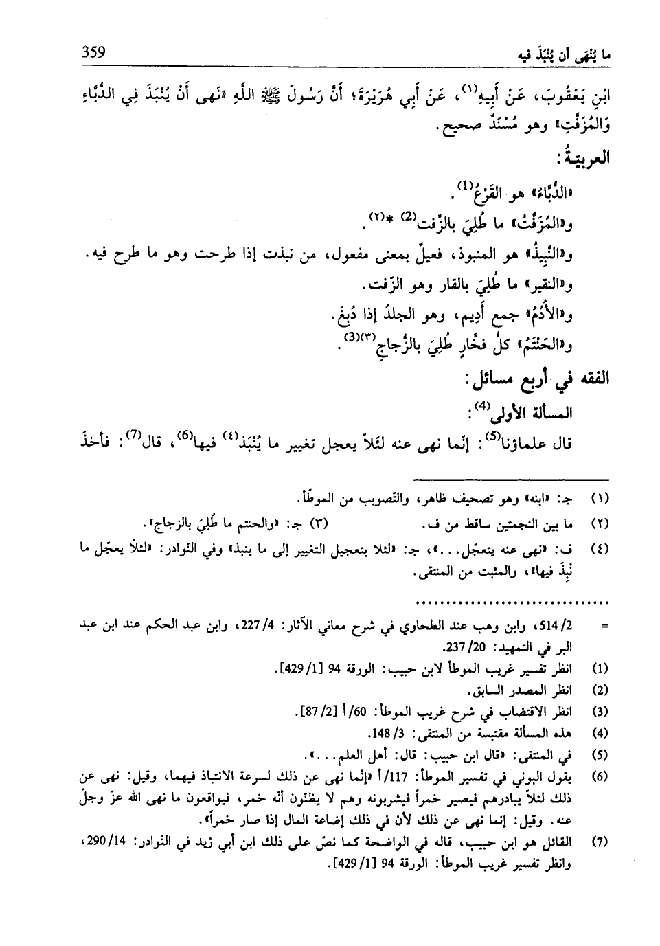 (¬6) يقول البوني ني تفسير الموطَّأ: 117/ أ "إنّما نهى عن ذلك لسرعة الانتباذ فيهما، وقيل: نهى عن ذلك لئلّا يبادرهم فيصير خمرًا فيشربونه وهم لا يظنّون أنّه خمر، فيواقعون ما نهى الله عَزَّ وَجَلَّ عنه. وقيل: إنّما نهى عن ذلك لأنَّ في ذلك إضاعة المال إذا صار خمرًا".